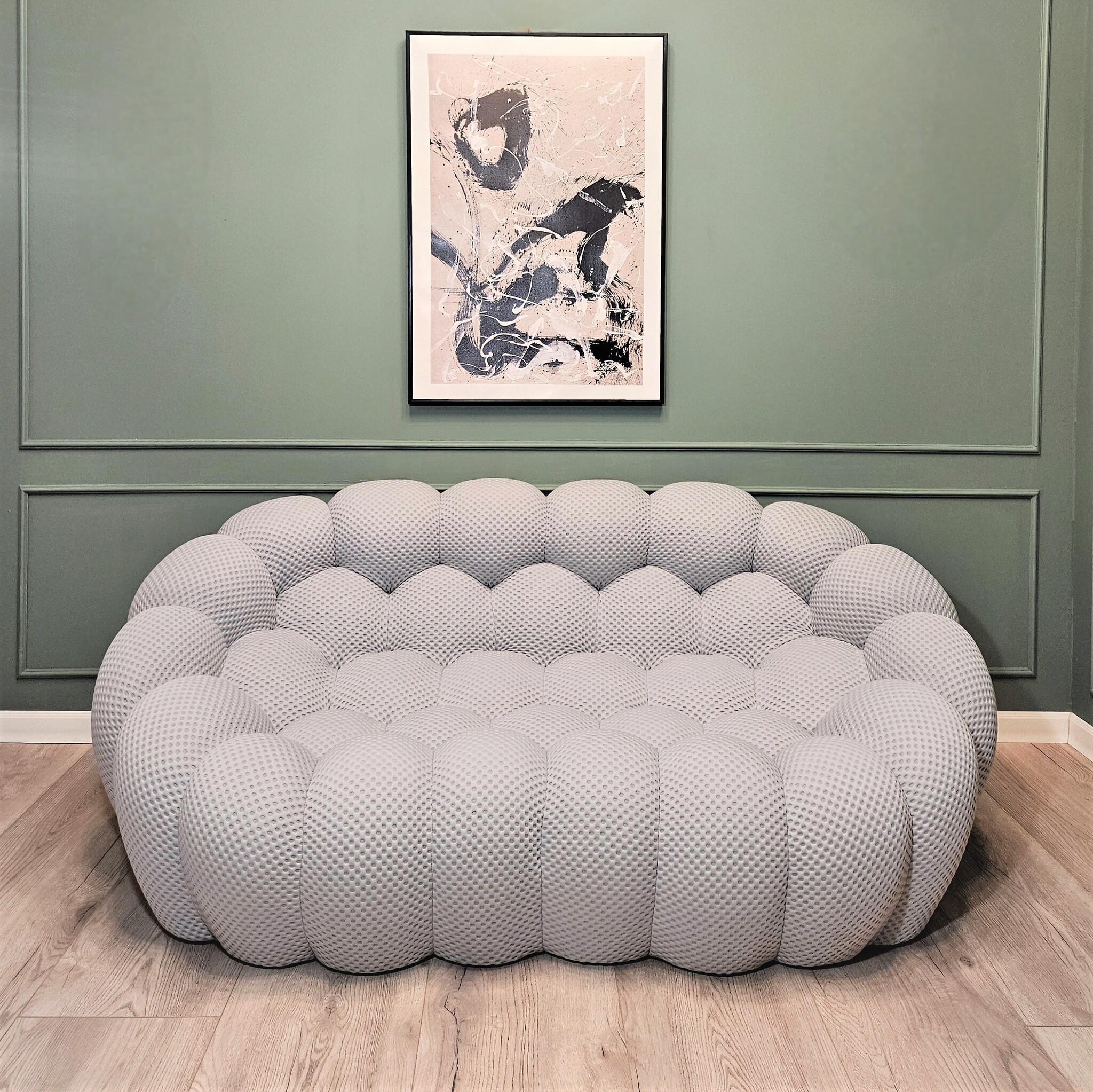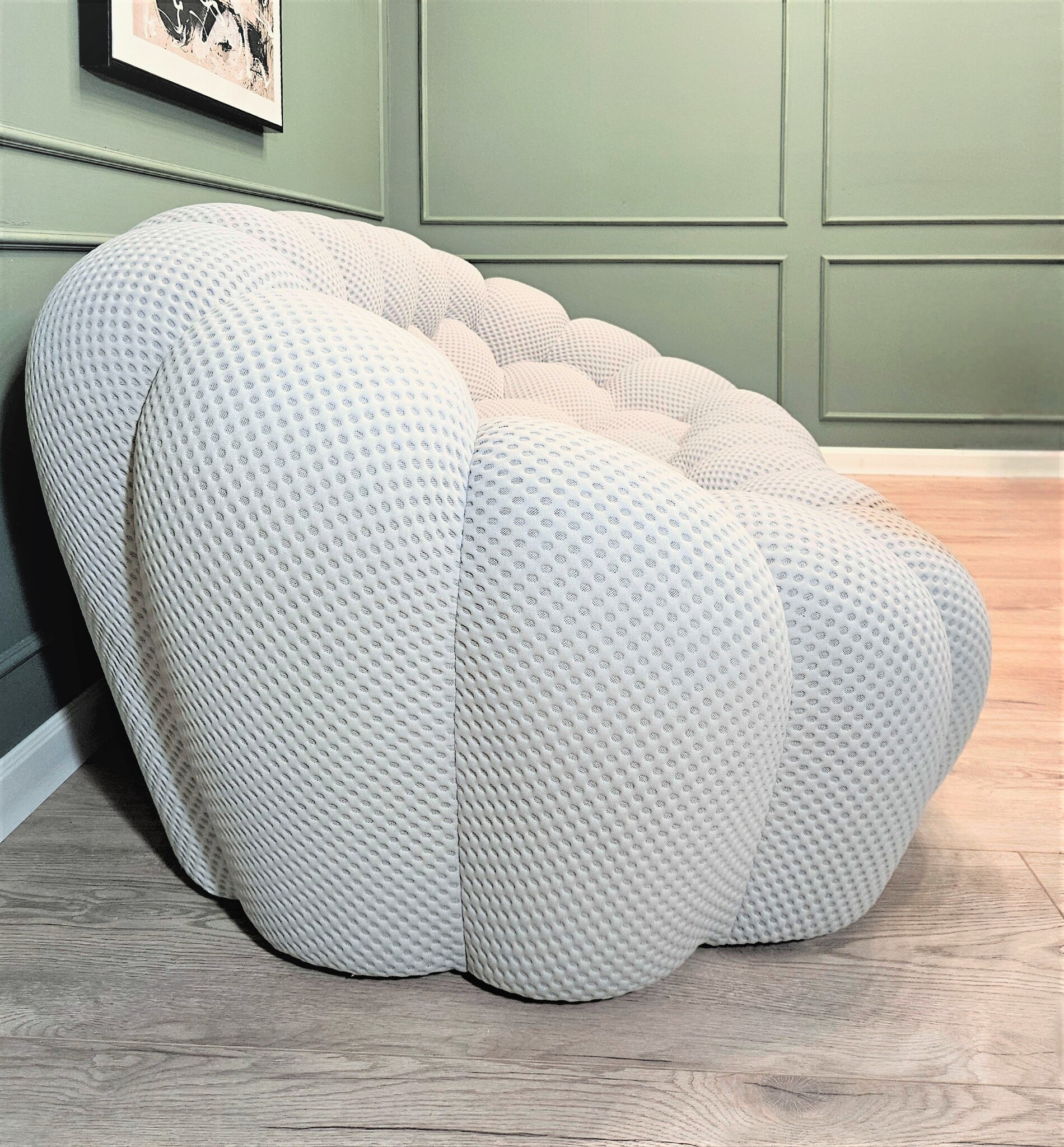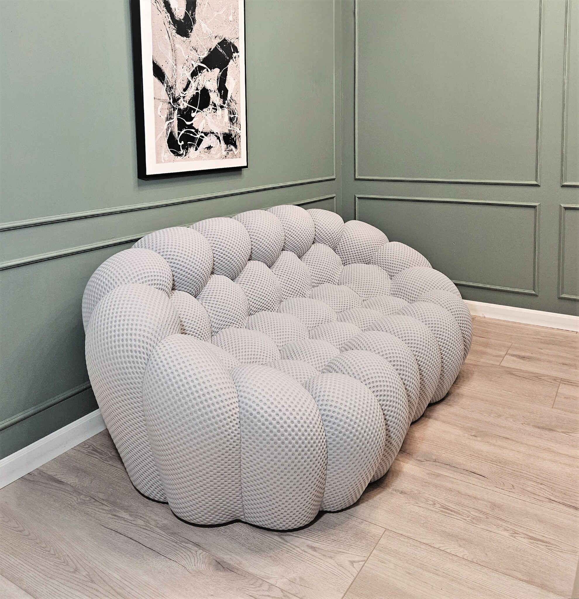 Вдохновленный натуральными и минеральными формами и полностью выполненный вручную, его дизайн потребовал разработки специальных эластичных тканей, которые идеально подходят к его округлым формам.