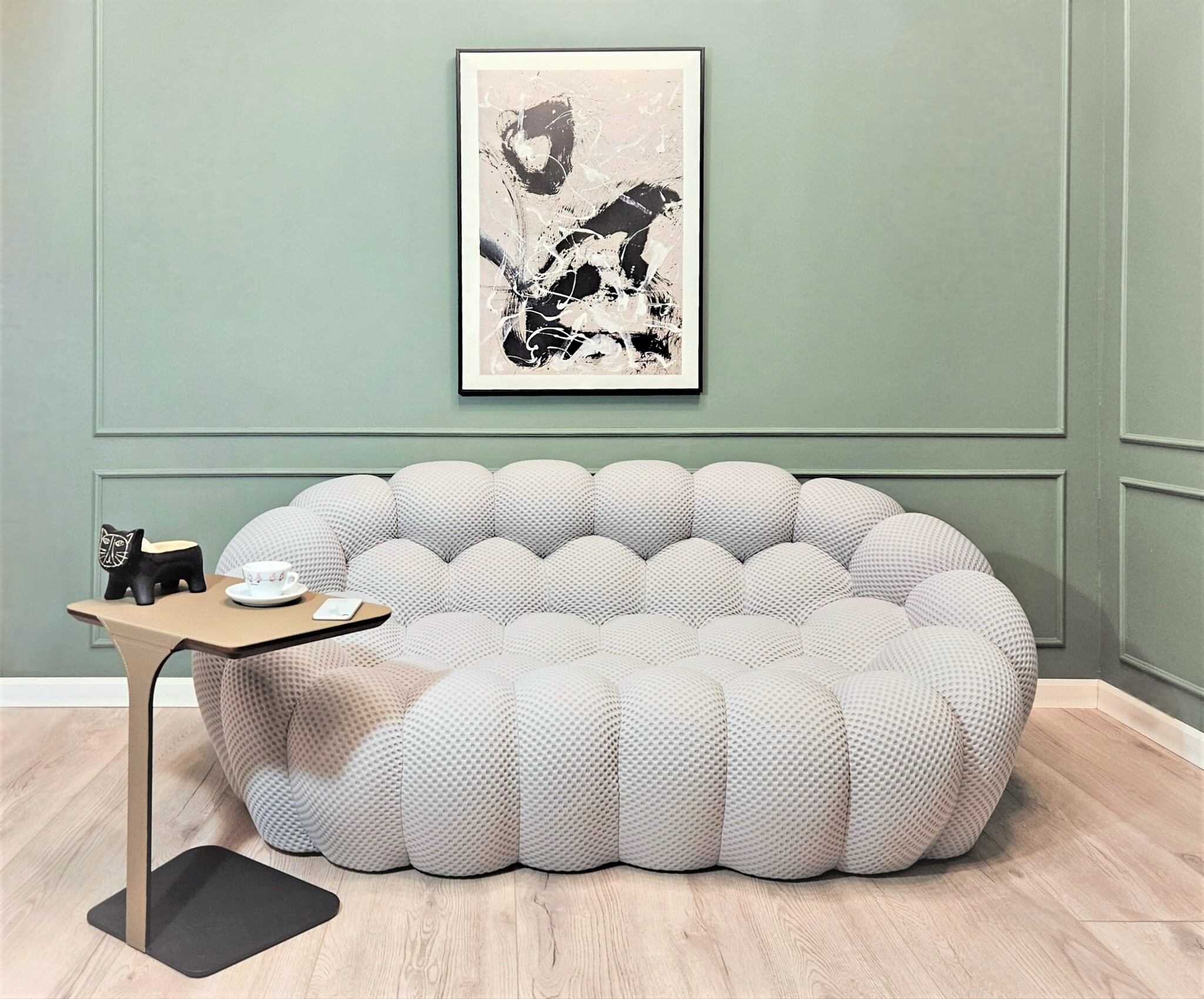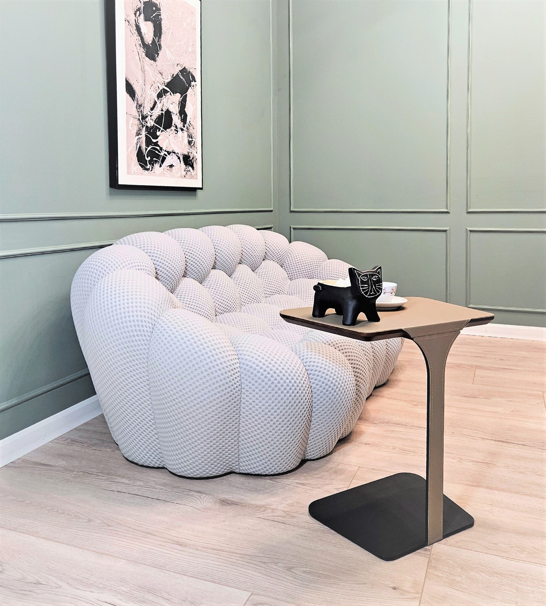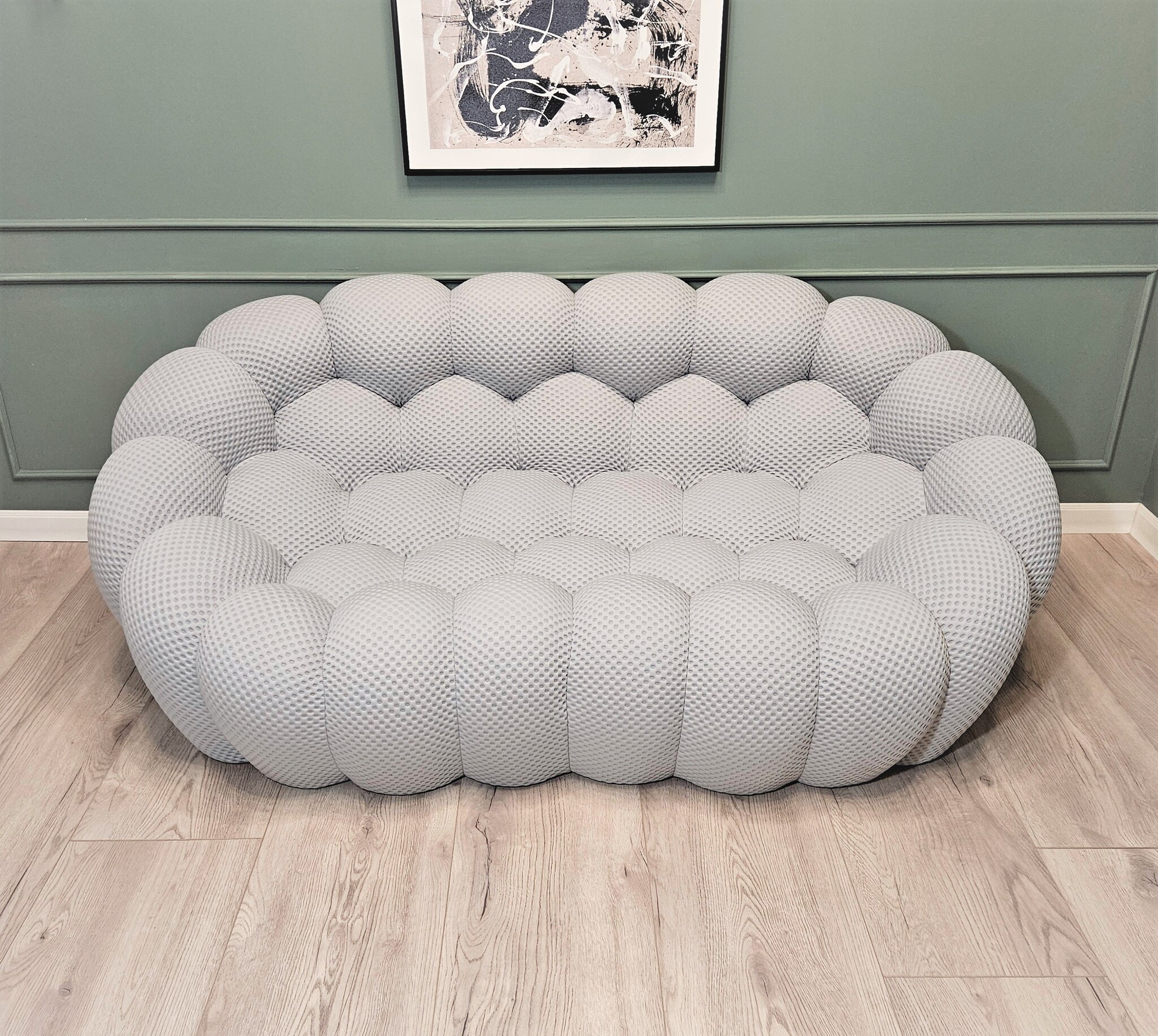 Вдохновленный натуральными и минеральными формами и полностью выполненный вручную, его дизайн потребовал разработки специальных эластичных тканей, которые идеально подходят к его округлым формам.