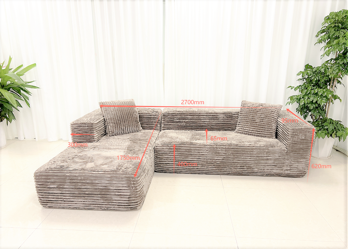 Большой угловой трехместный диван в комплекте с двумя подушками.