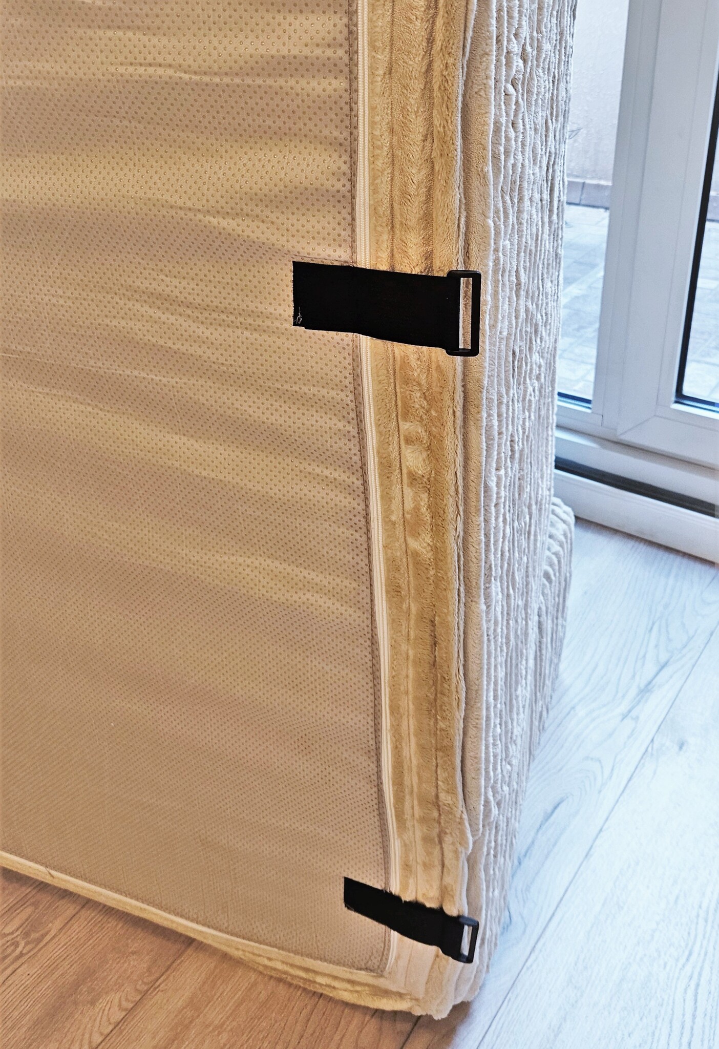 Диван состоит из двух модулей. Модули соединяются между собой ремнями.