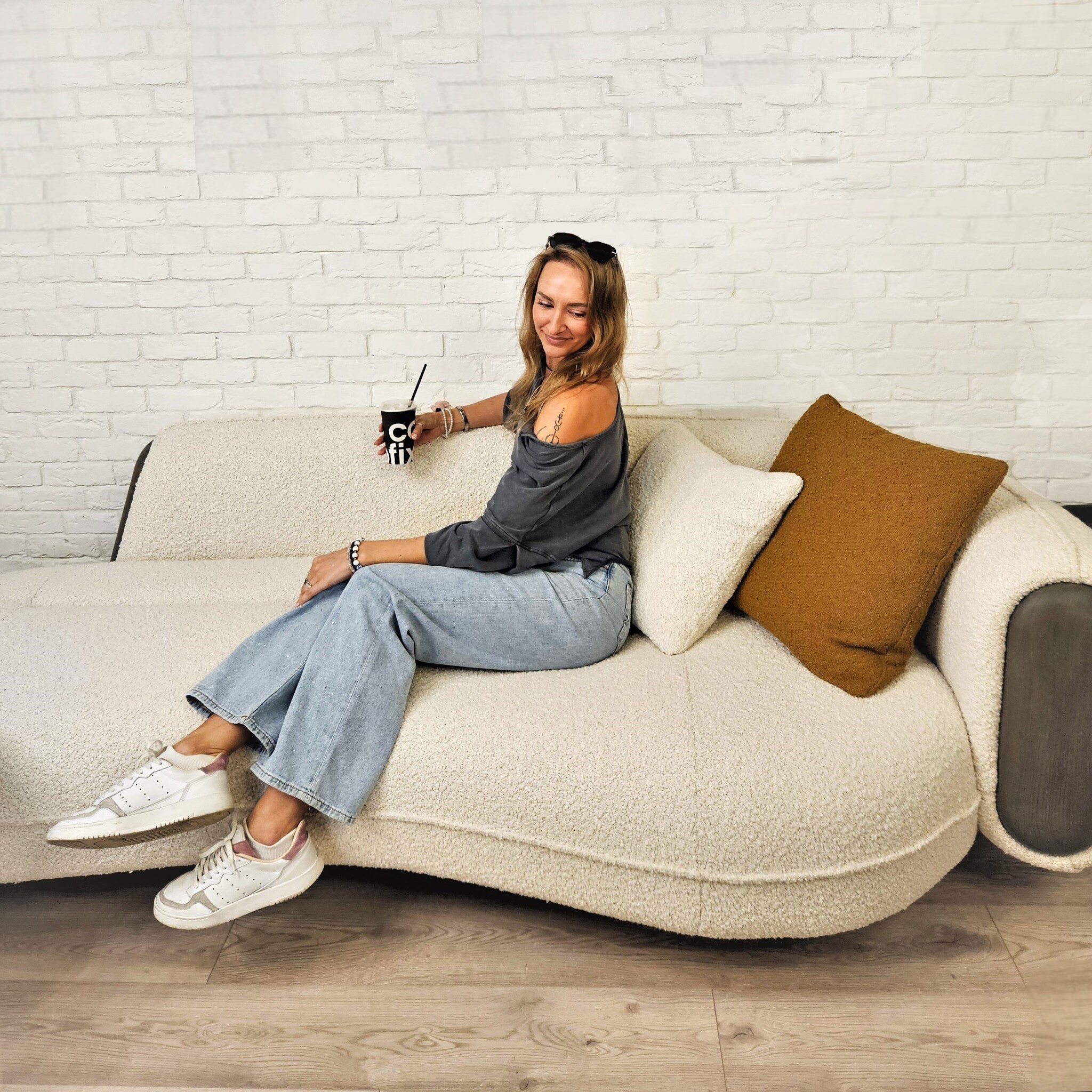Диван представлен в ткани букле, цвет античный белый. Медальоны в подлокотнике из массива ясеня, цвет серый. Угол дивана правый.
