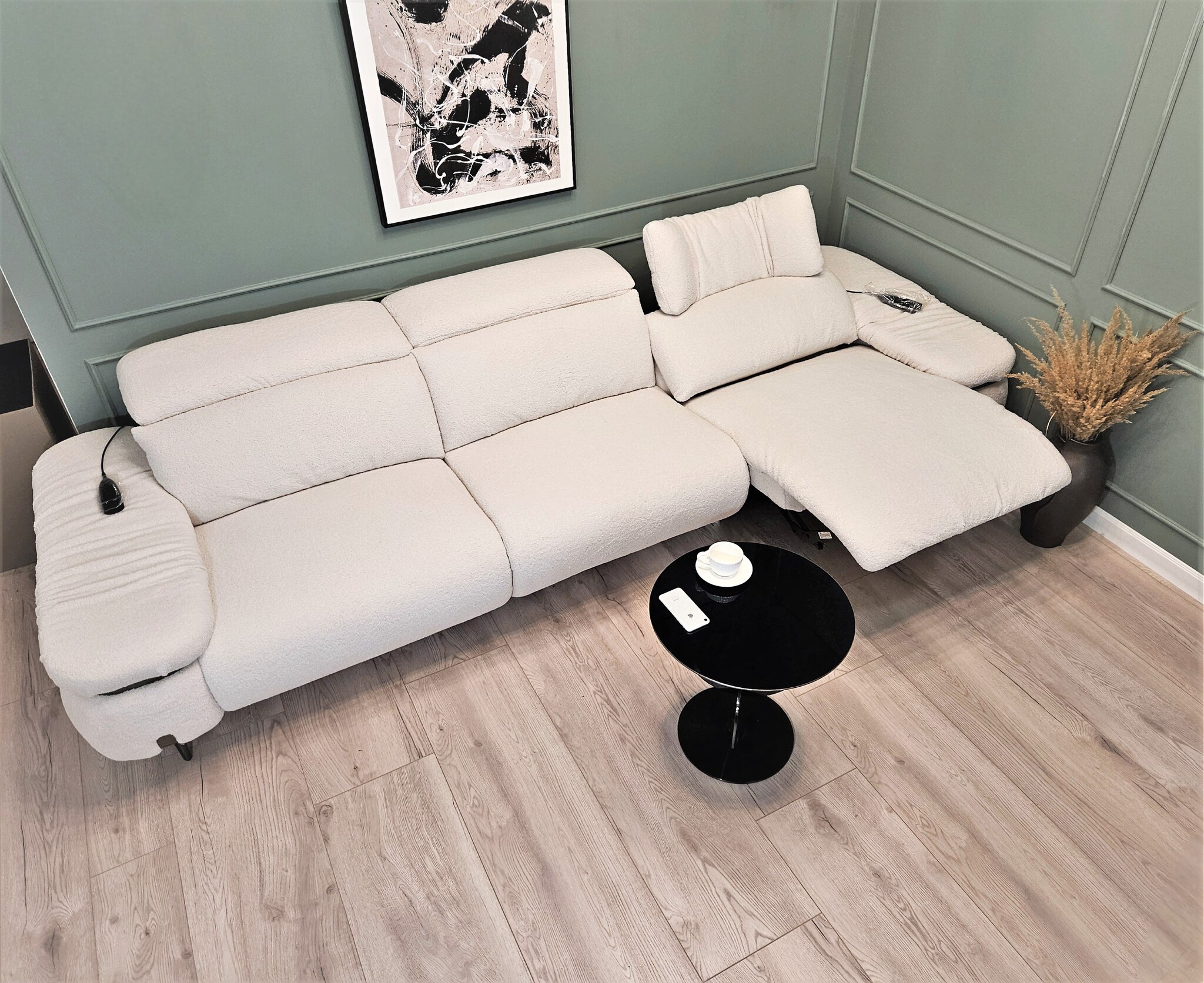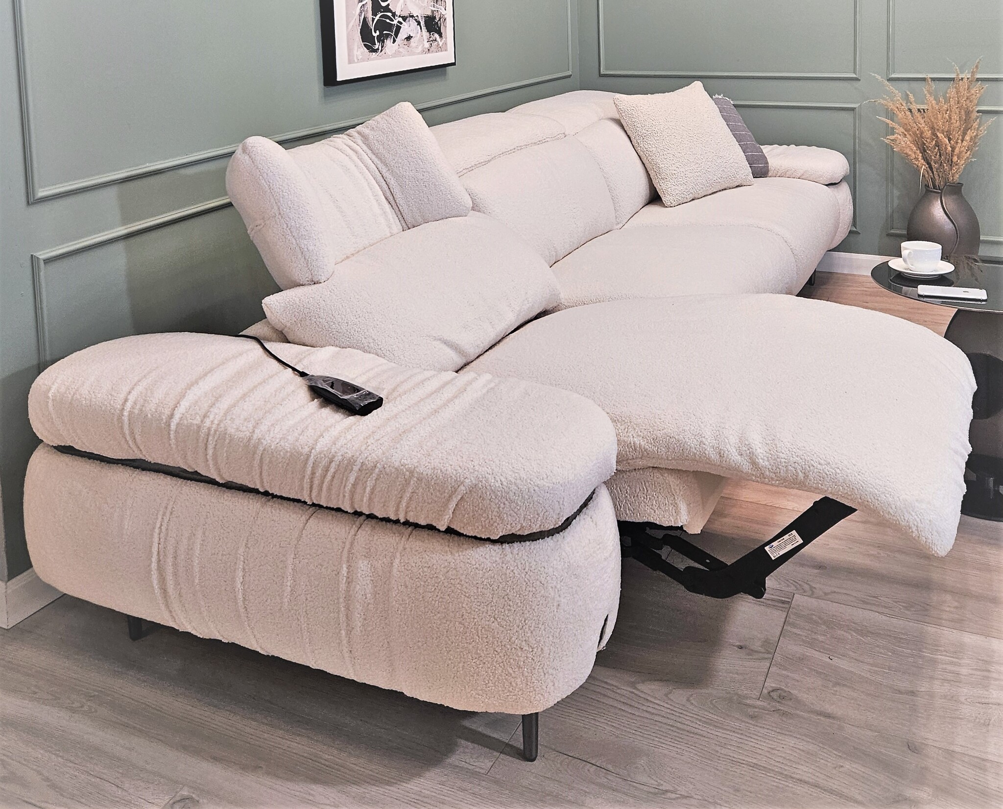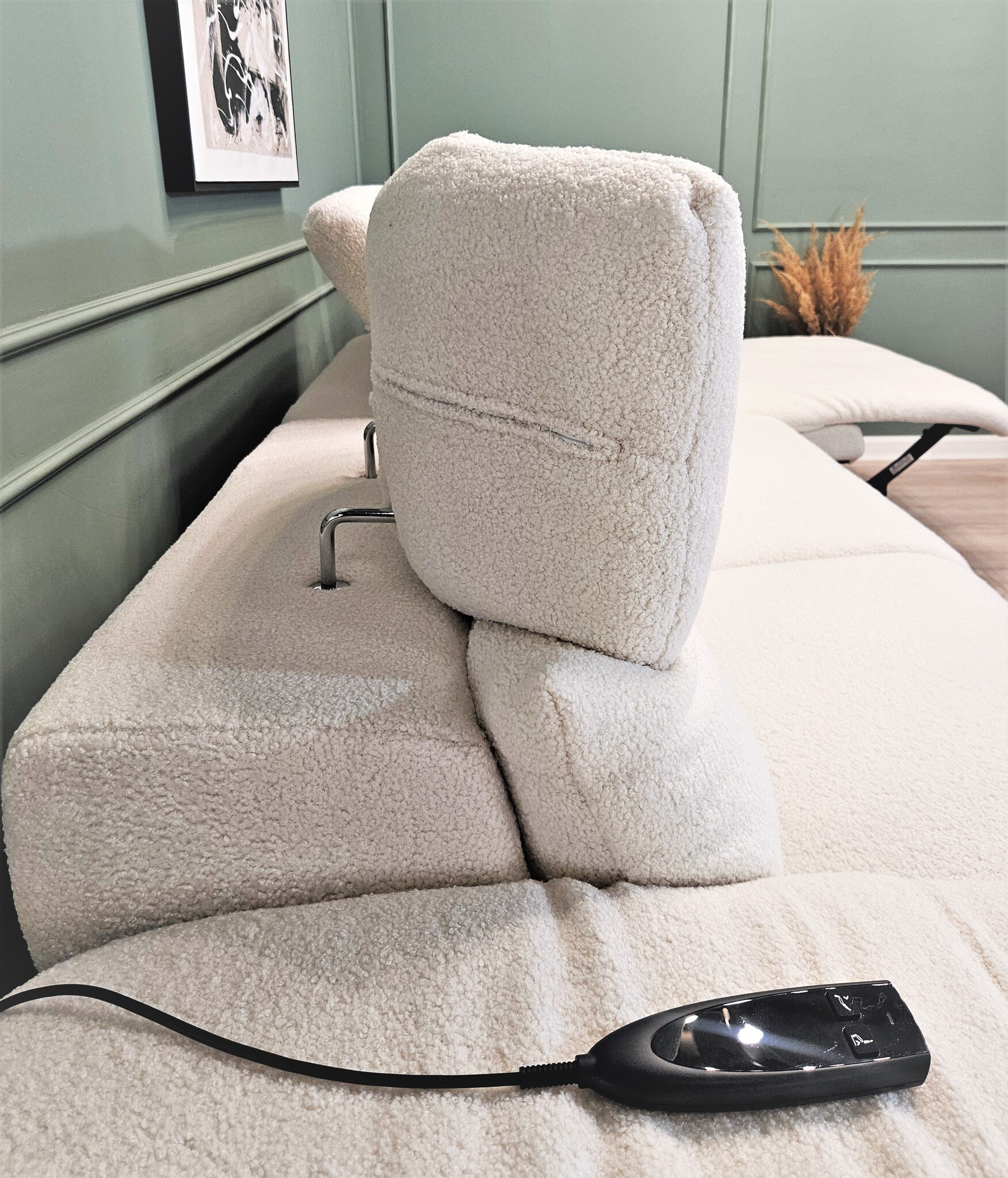 Диван-реклайнер оснащен двумя раздвижными электро-механизмами и регулируемыми подголовниками, позволяющими подобрать наиболее удобное положение.