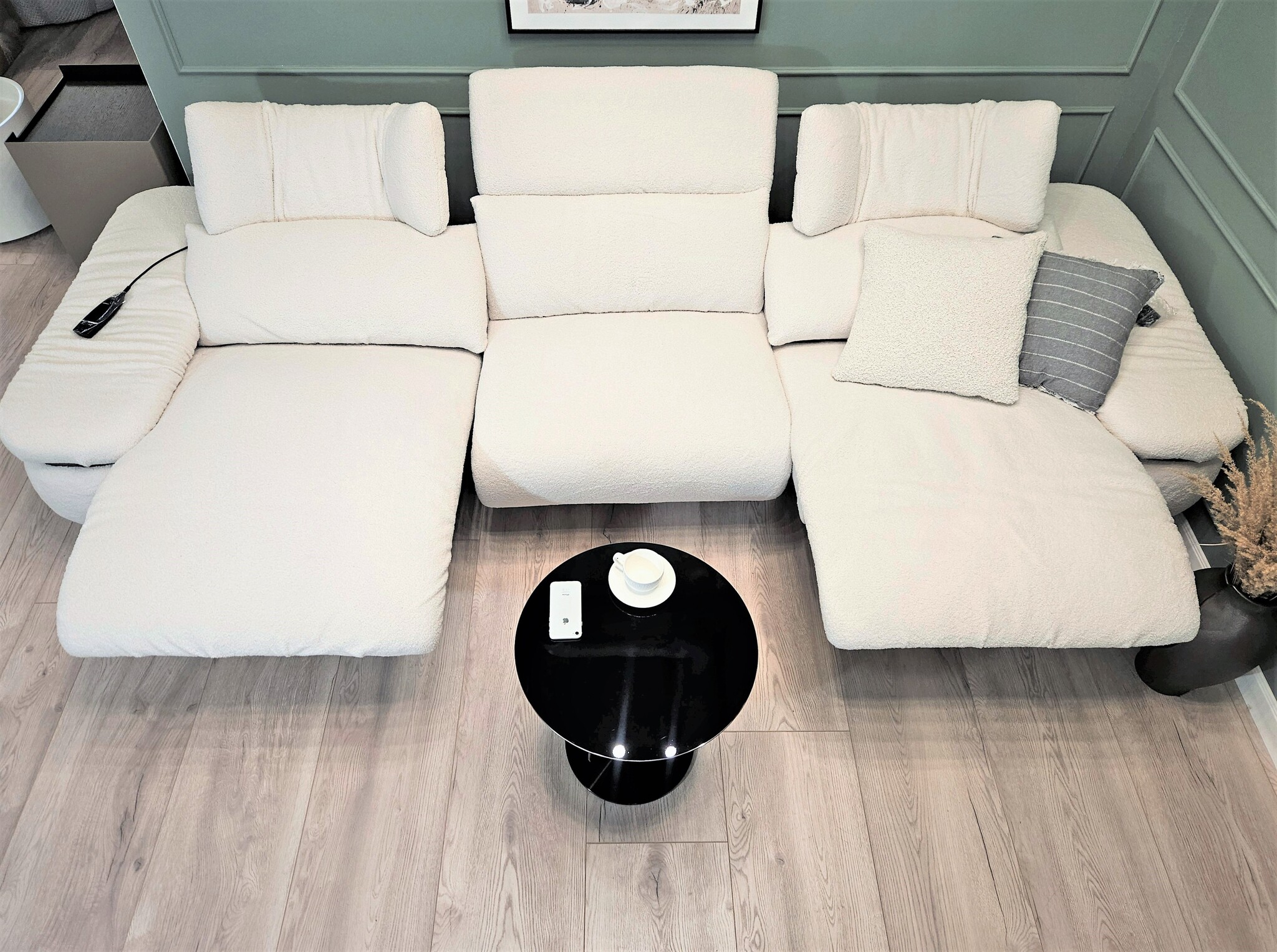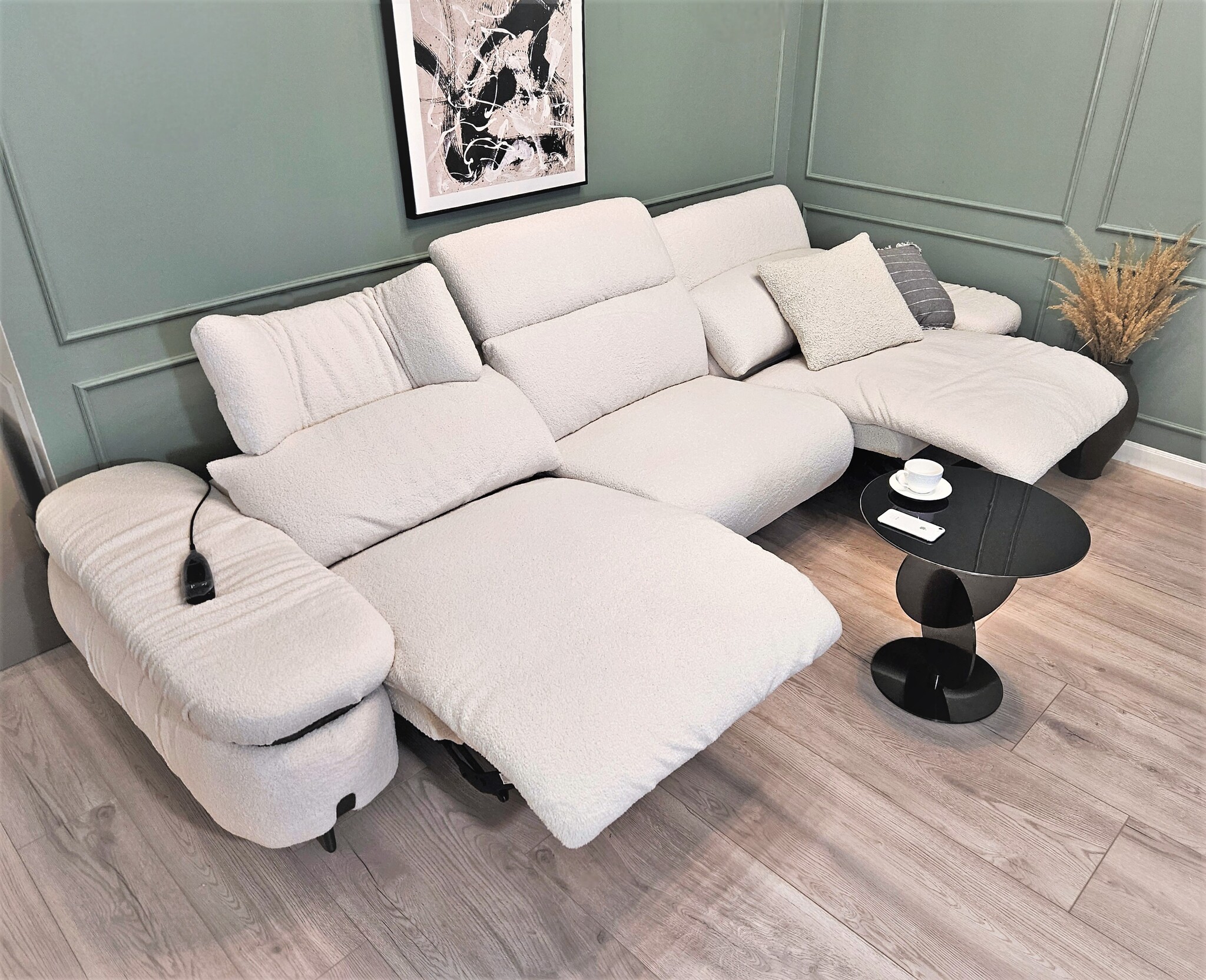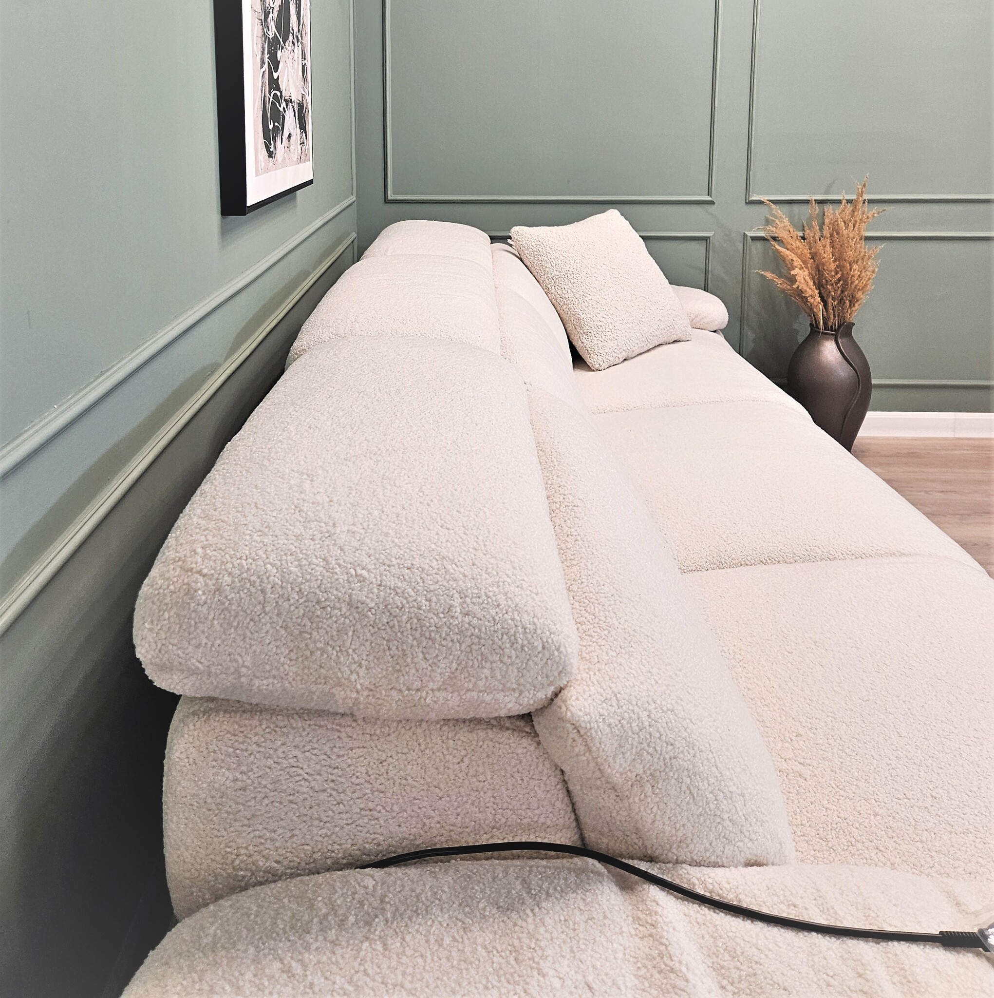 Диван-реклайнер оснащен двумя раздвижными электро-механизмами и регулируемыми подголовниками, позволяющими подобрать наиболее удобное положение.