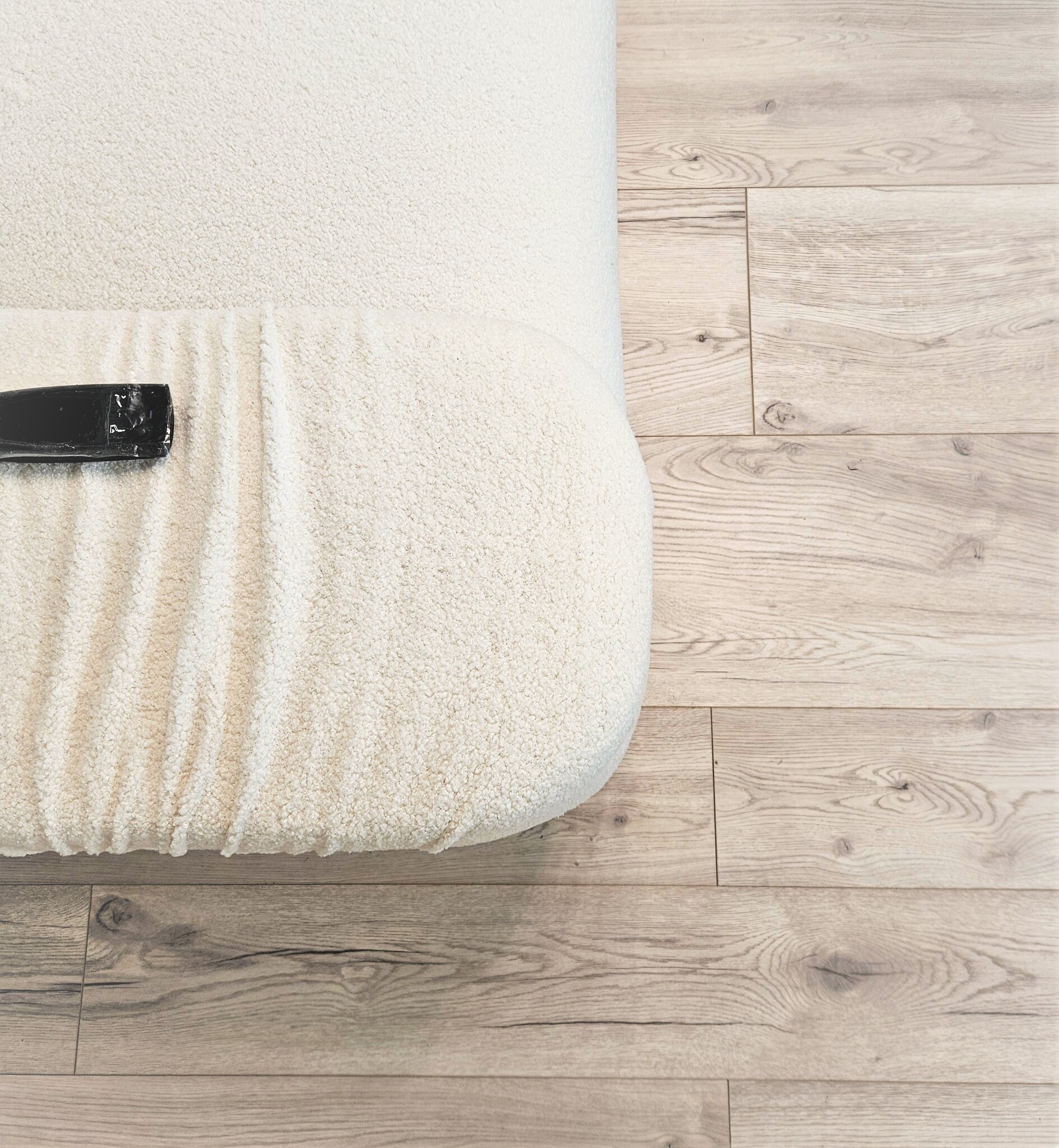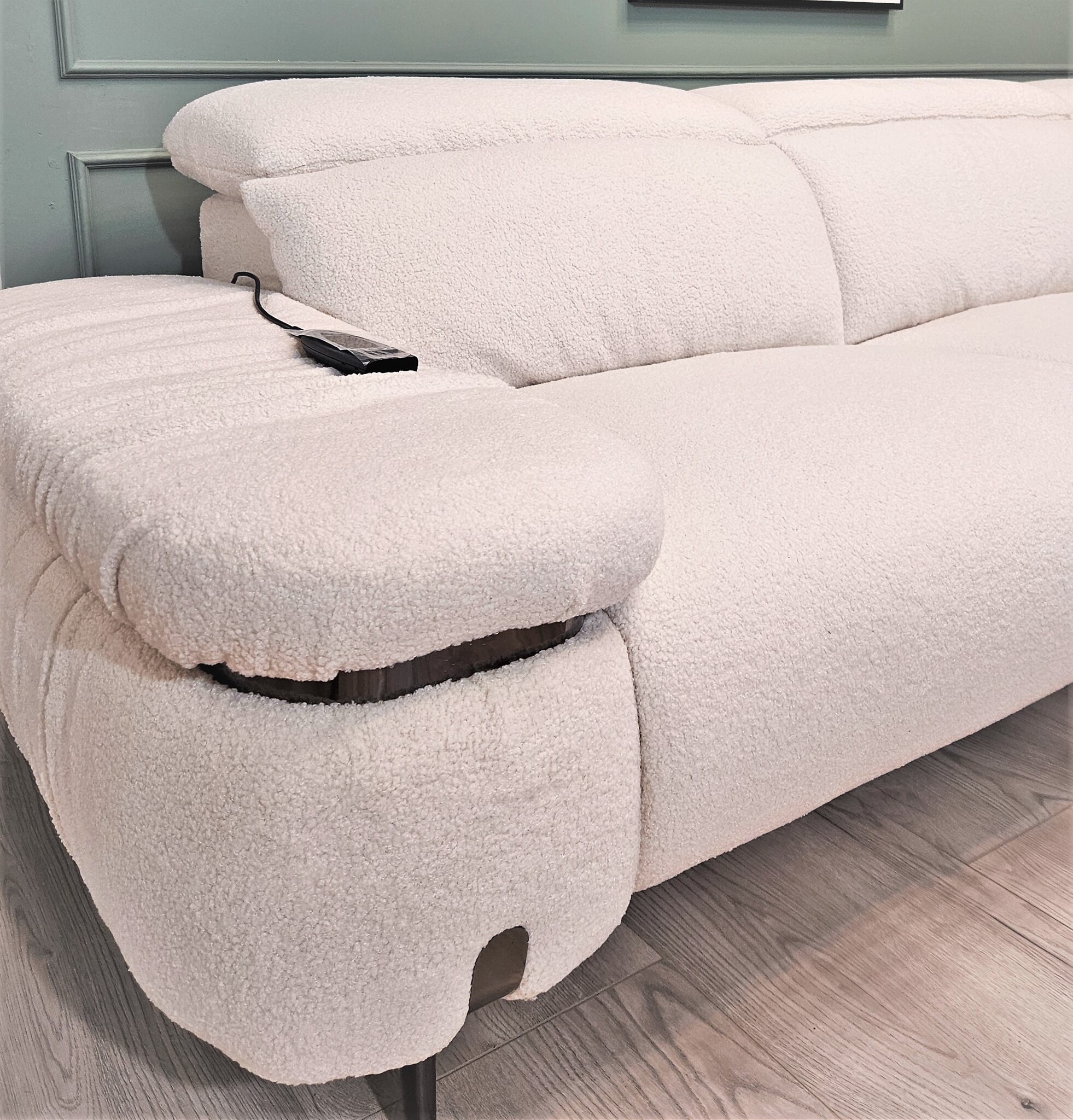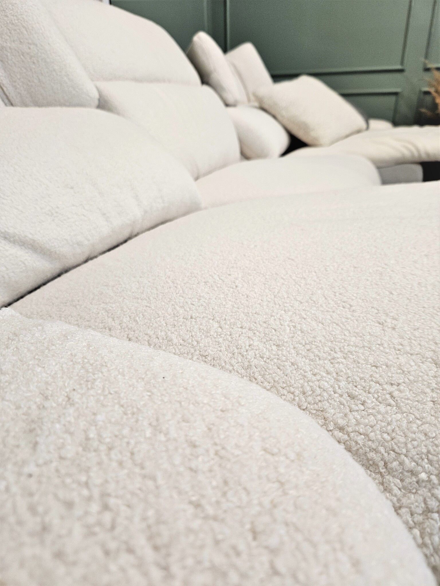 Реклайнер представлен в мягкой ткани букле. Цвет в наличии - античный белый.