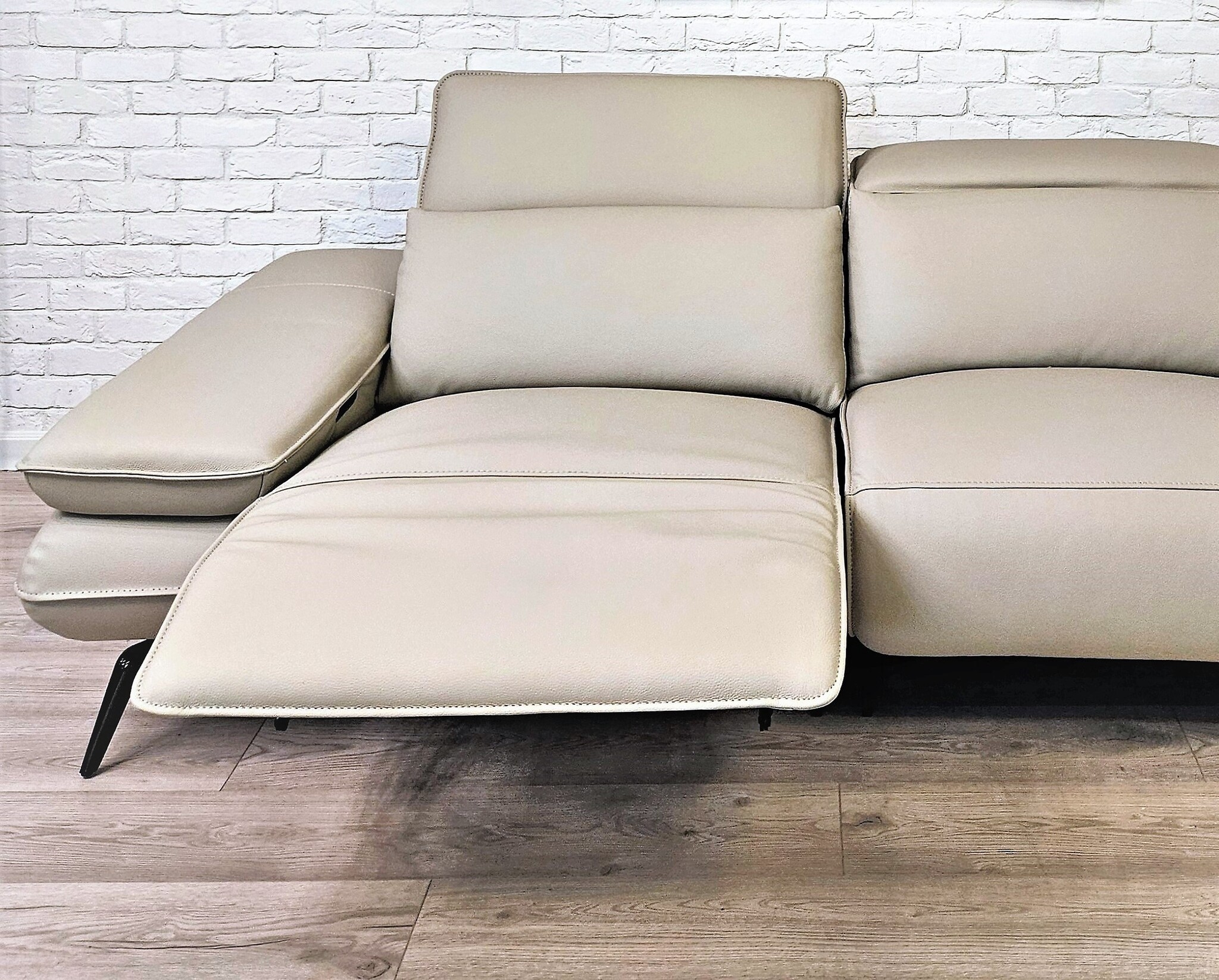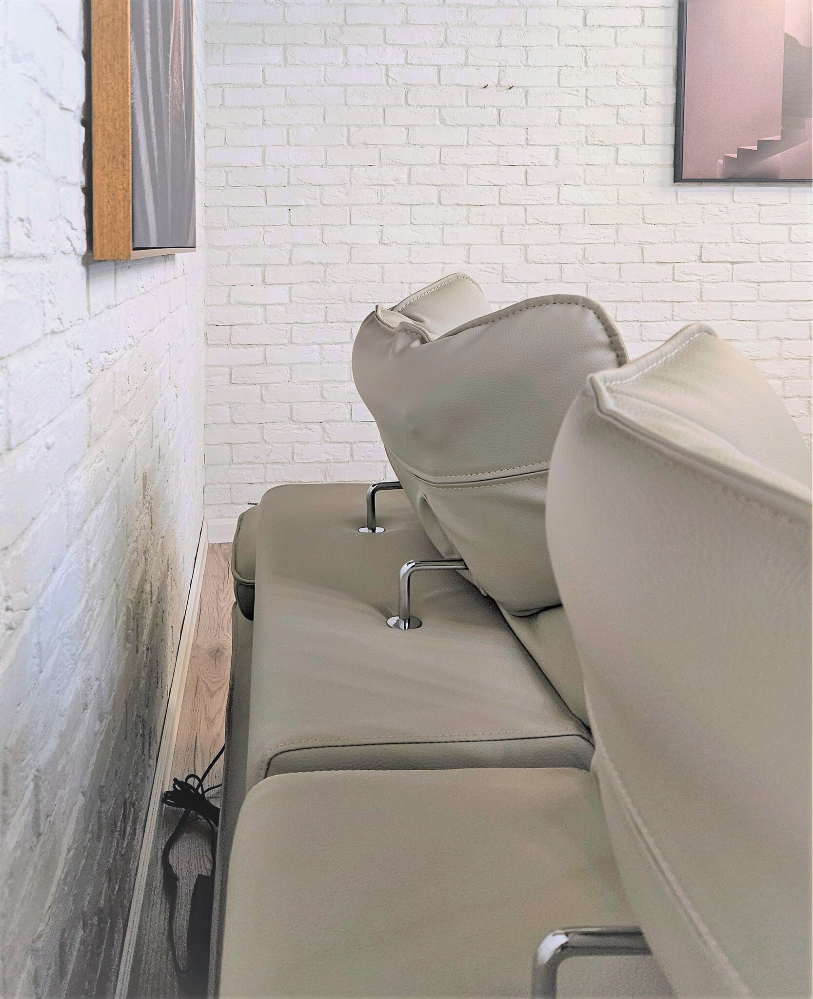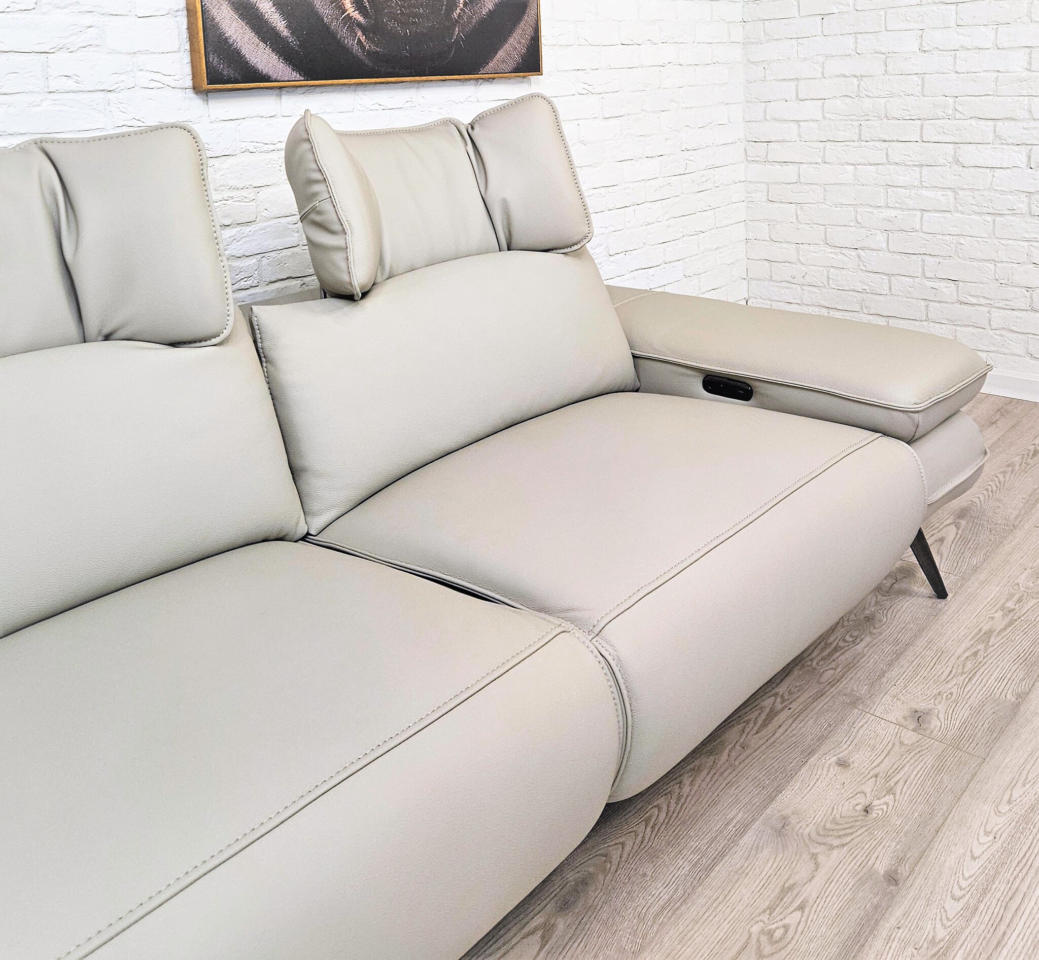 Диван-реклайнер оснащен двумя раздвижными электро-механизмами и регулируемыми подголовниками, позволяющими подобрать наиболее удобное положение.
