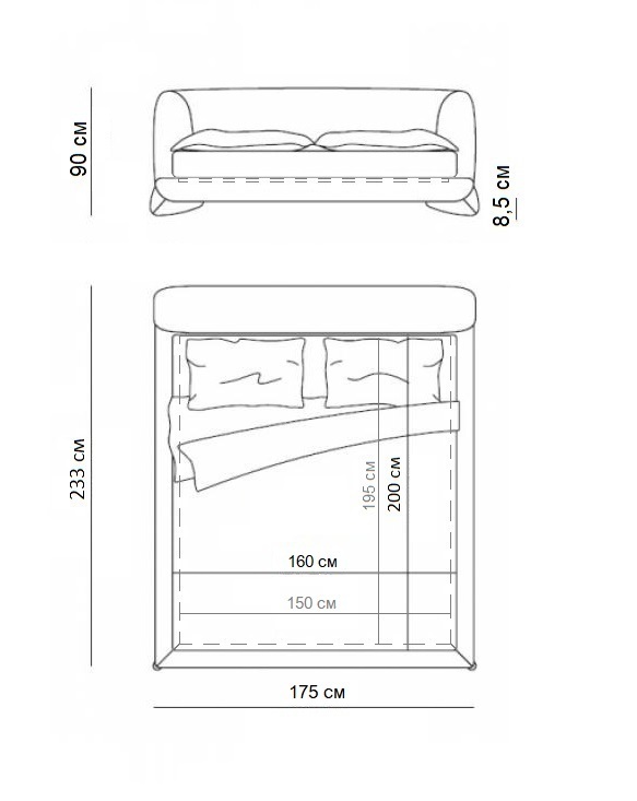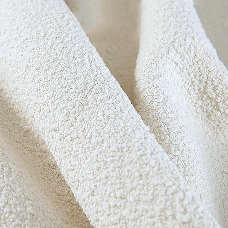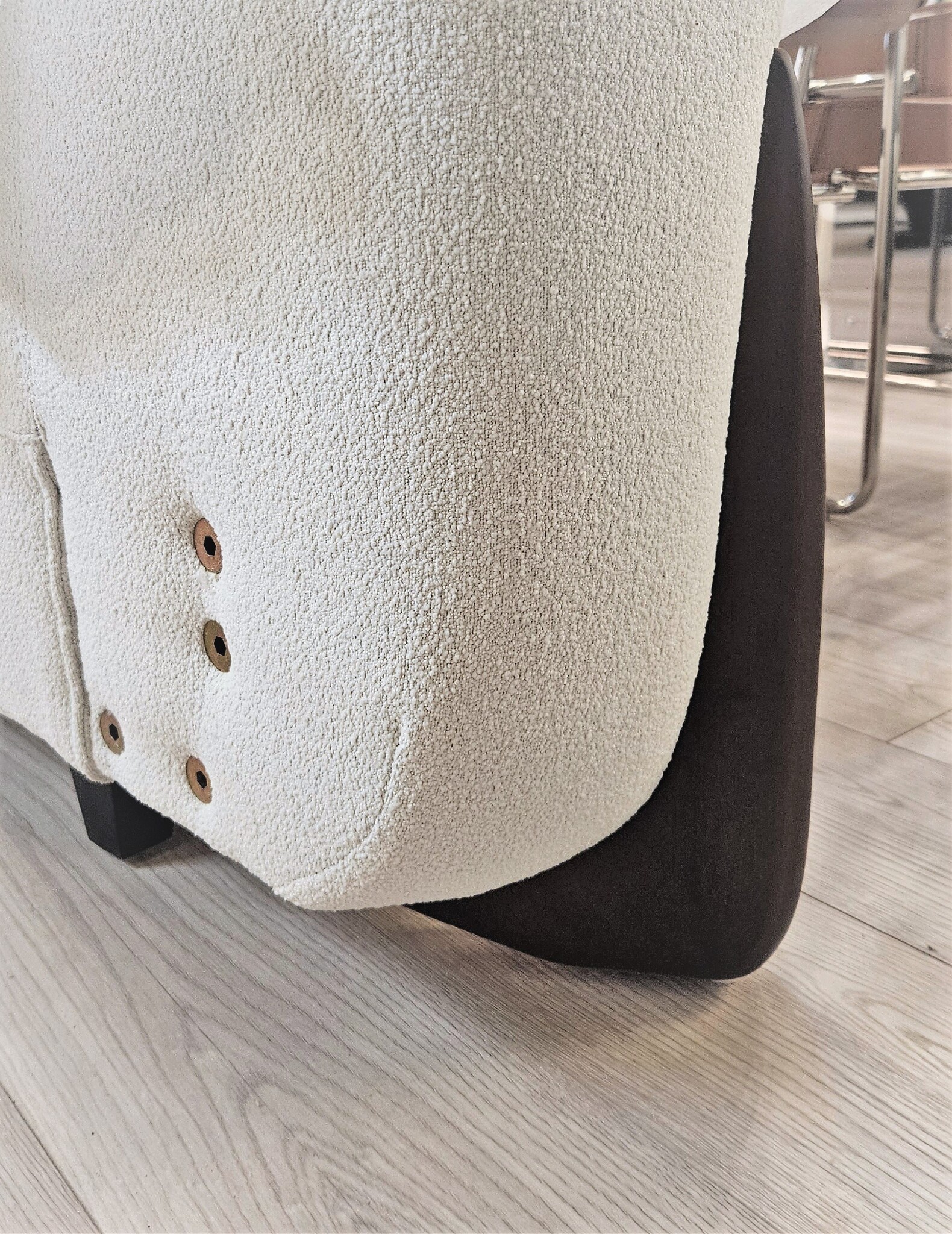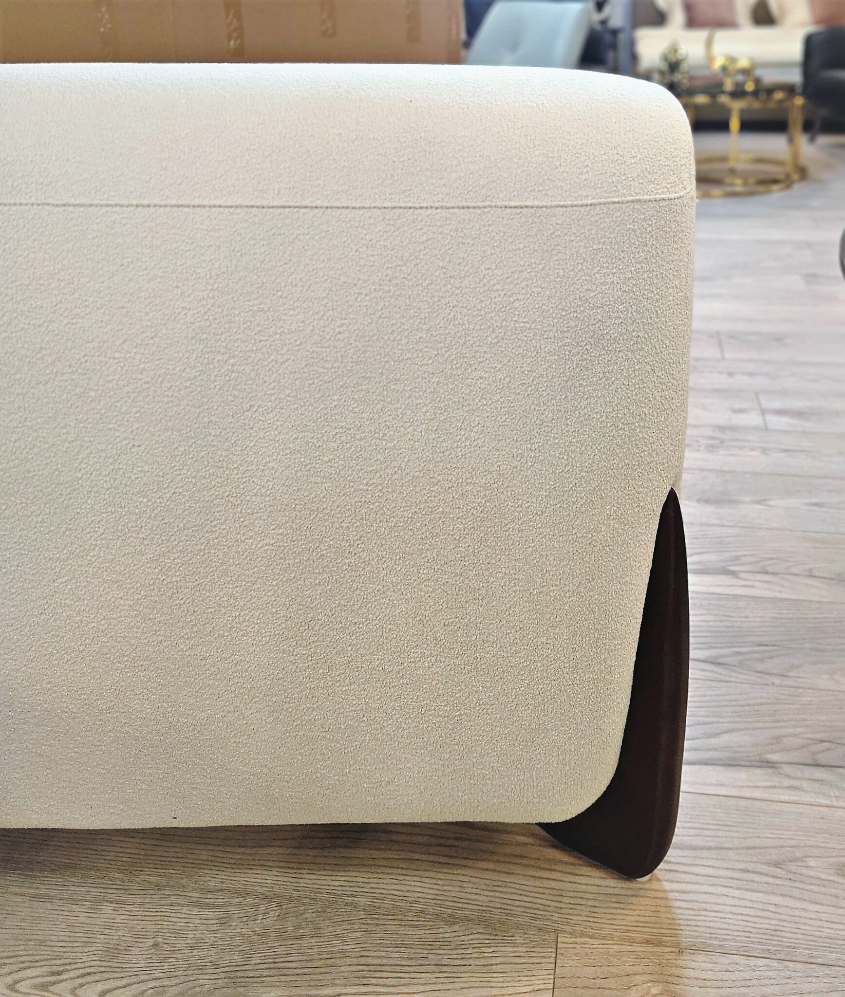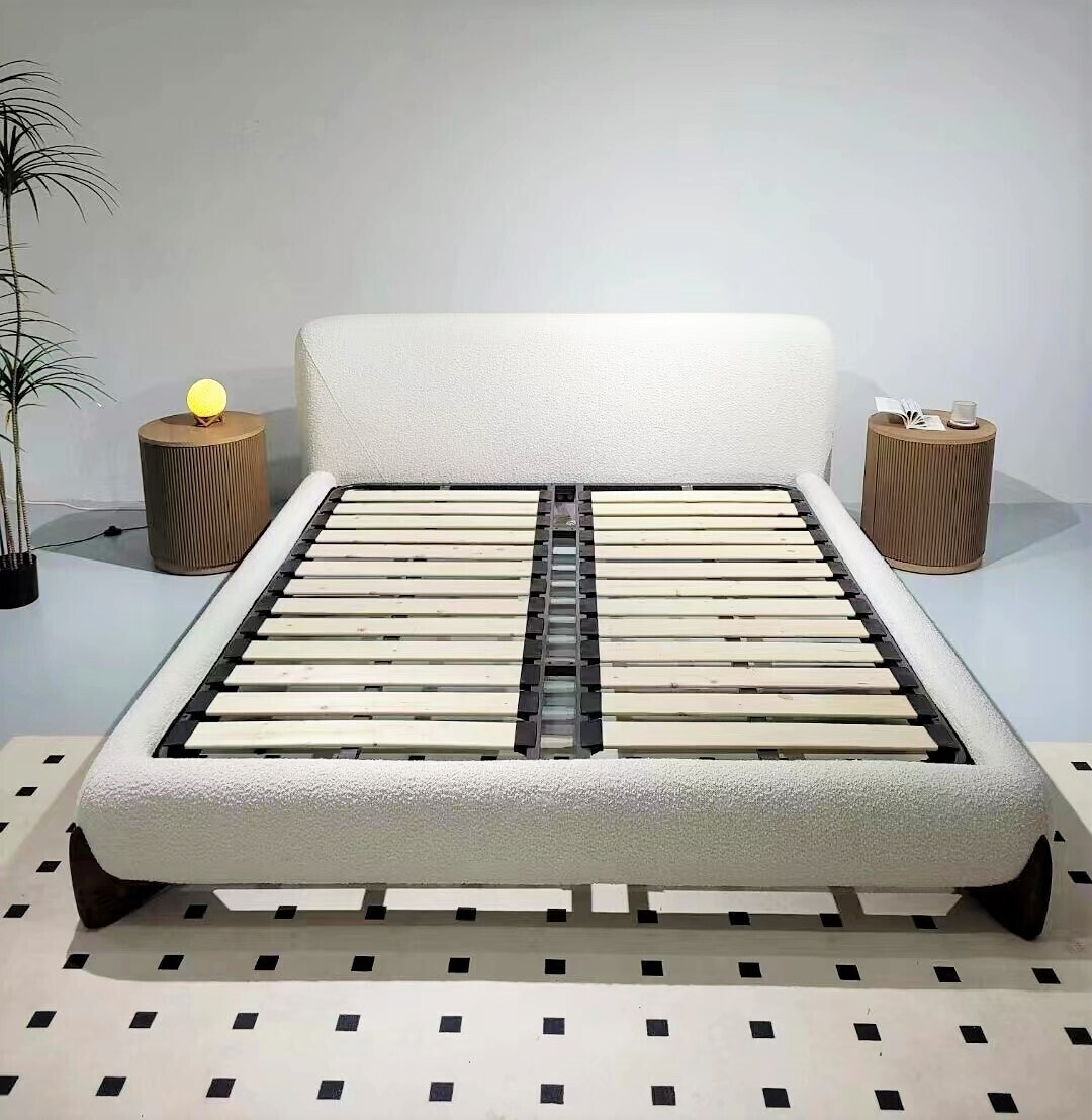 Кровать представлена в мягкой ткани букле цвета Античный белый.