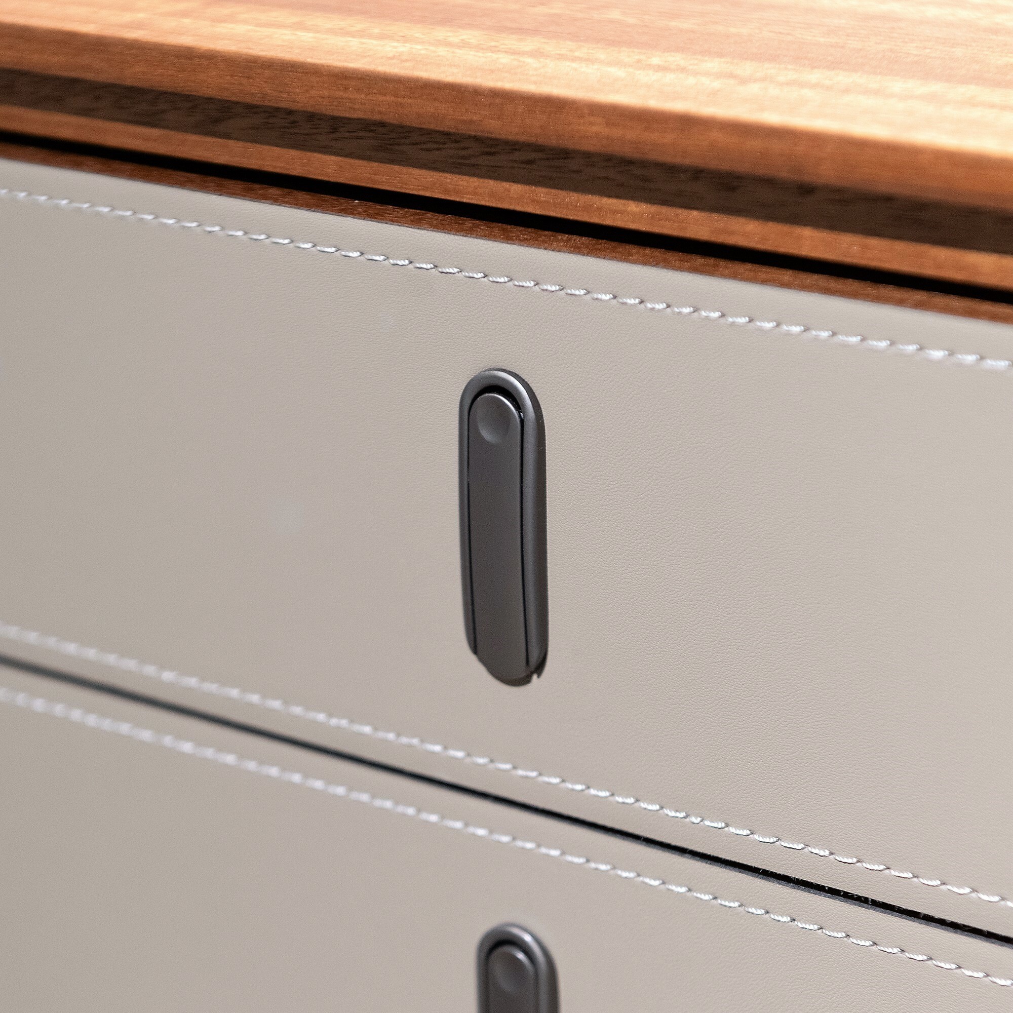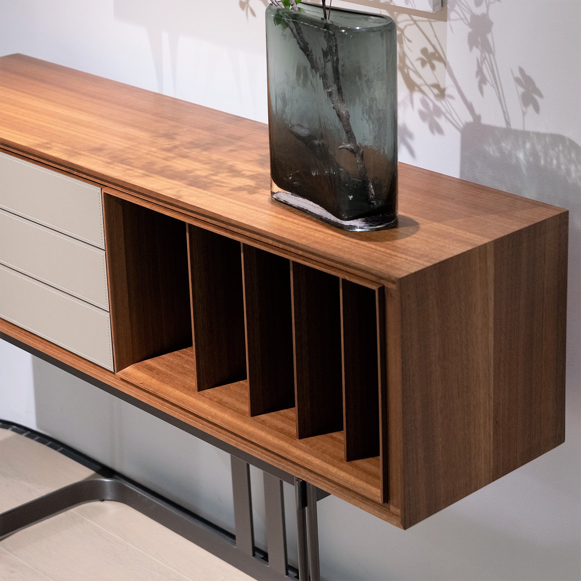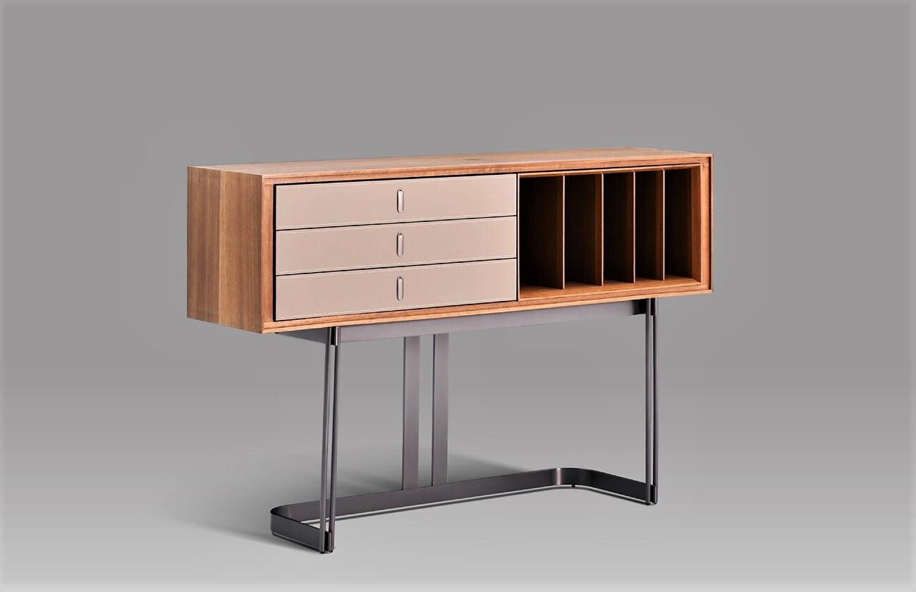 Комод с выдвижными ящиками и открытым отделением выполнен в отделке из экокожи и шпона эвкалипта.