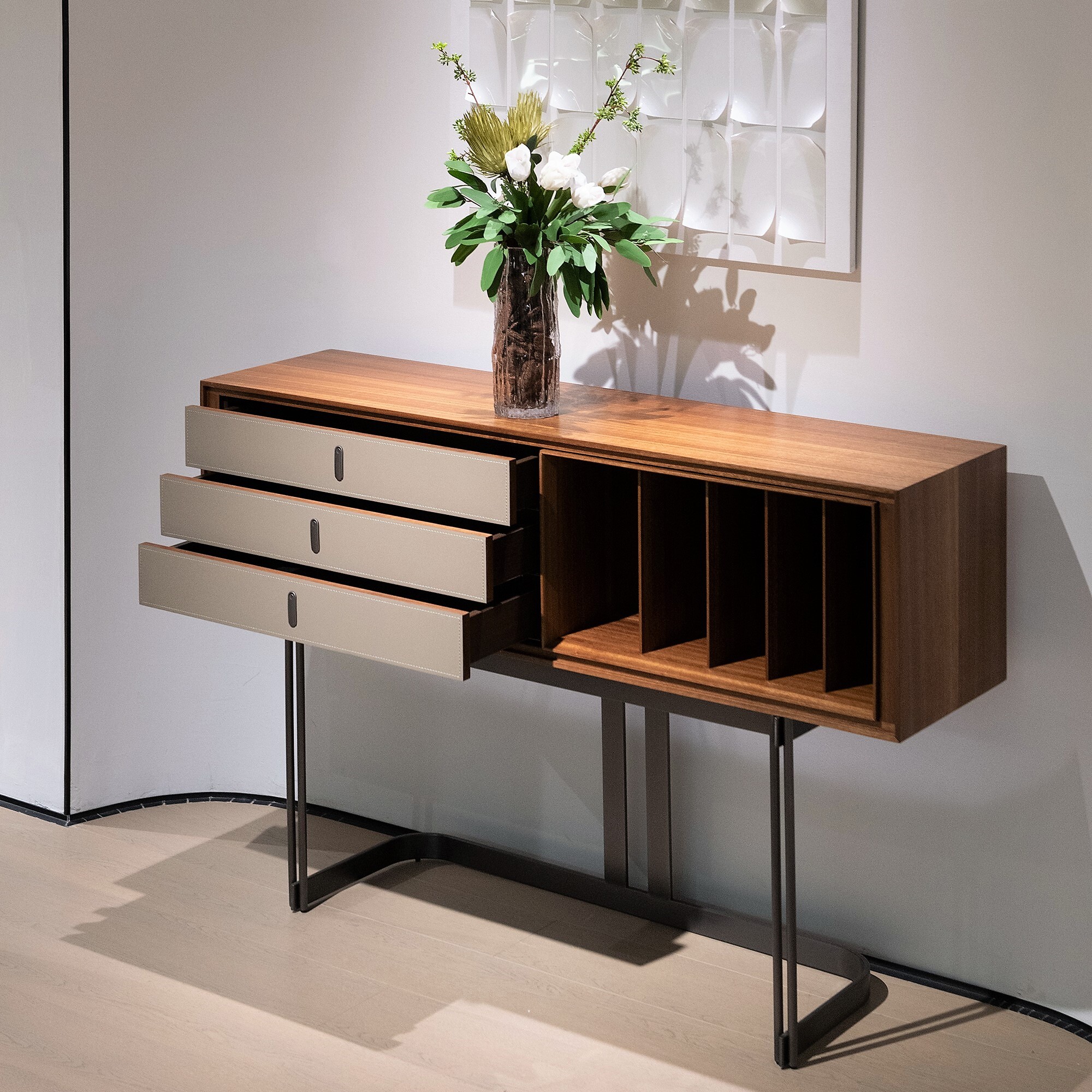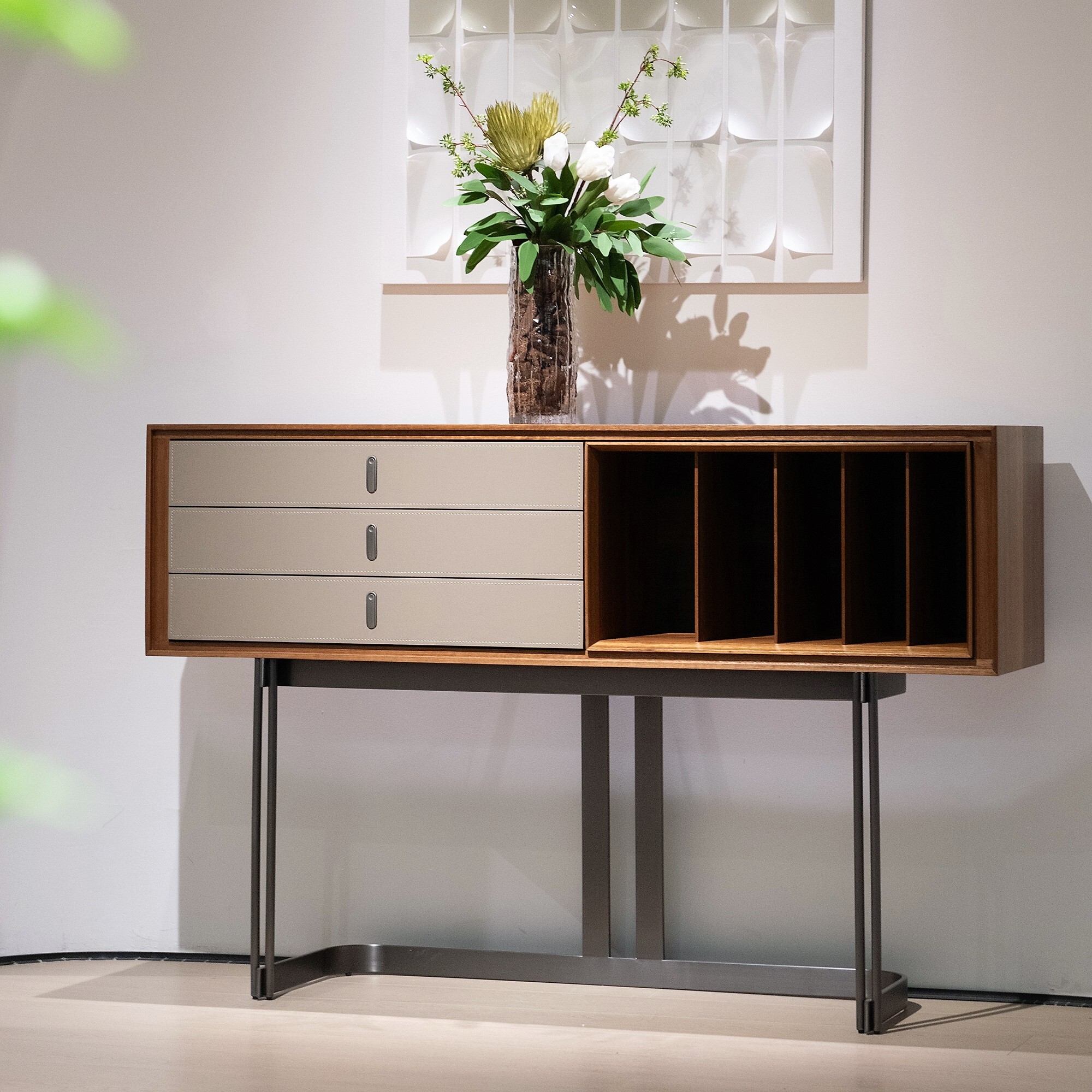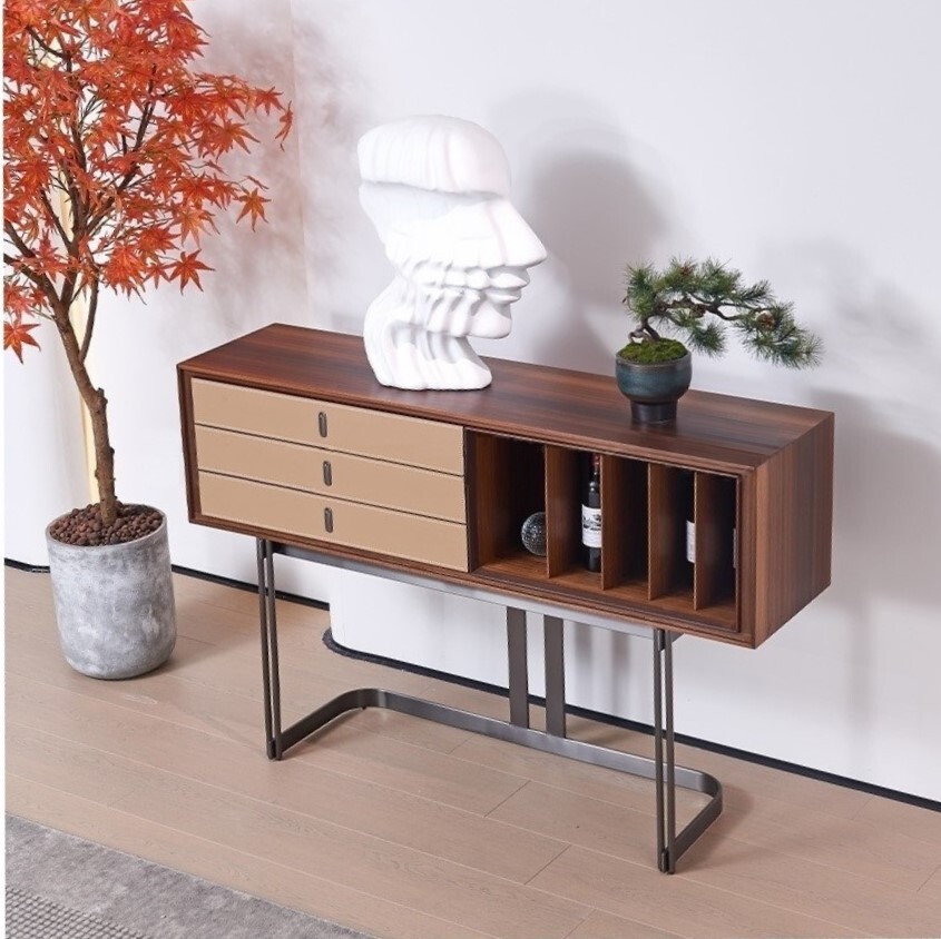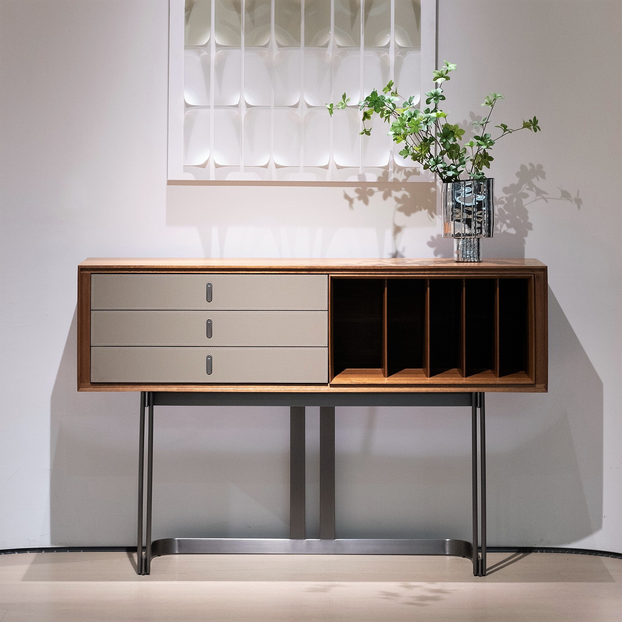 Комод с выдвижными ящиками и открытым отделением выполнен в отделке из экокожи и шпона эвкалипта.