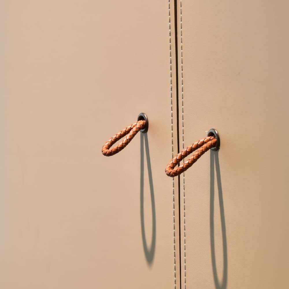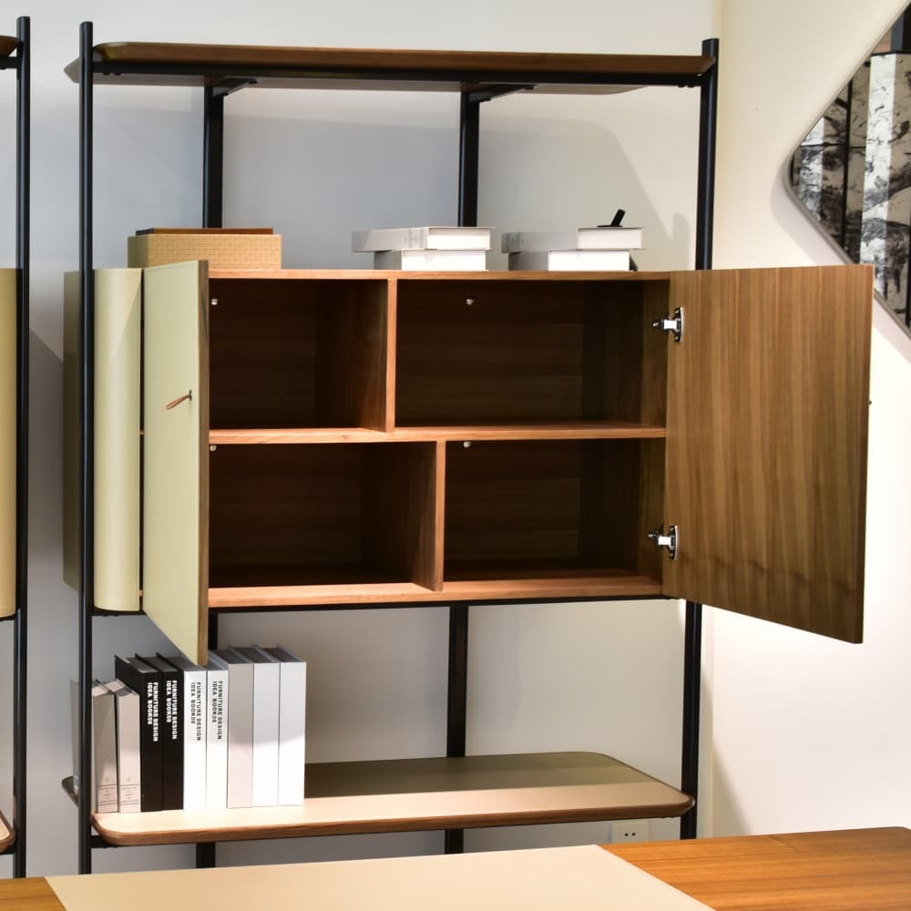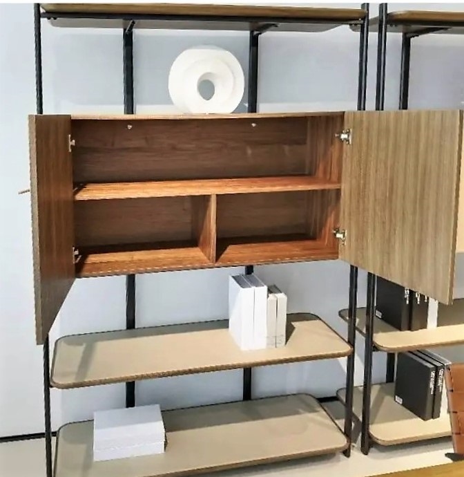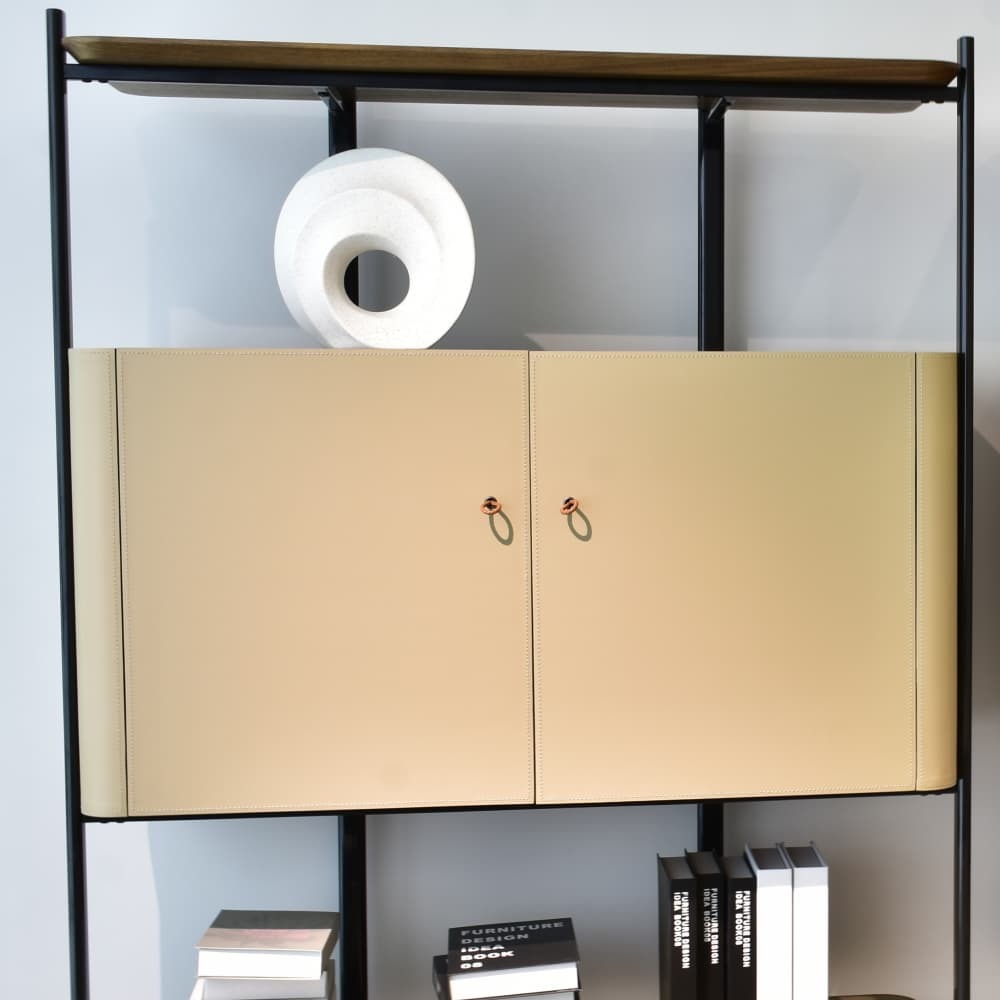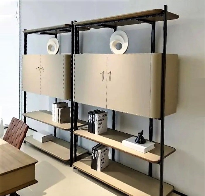 Стеллаж сочетает элегантность шпона и практичность экокожи.