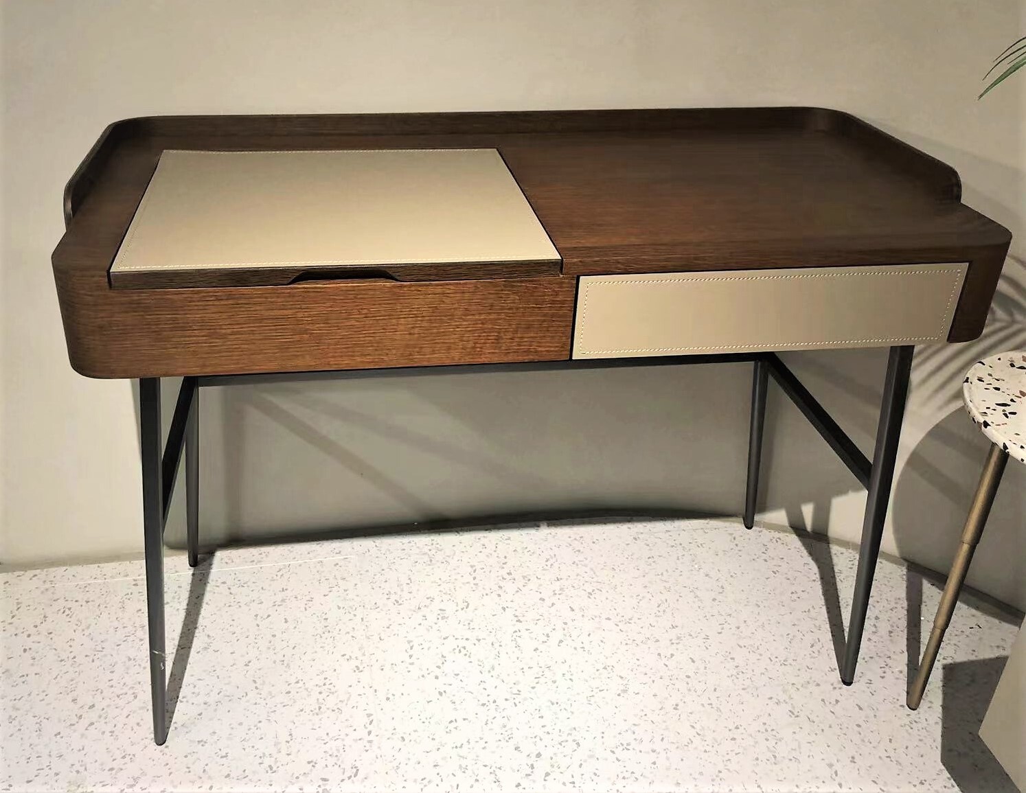 Консольный столик выполнен в современном стиле с отделкой из натурального шпона и вставками из экокожи.