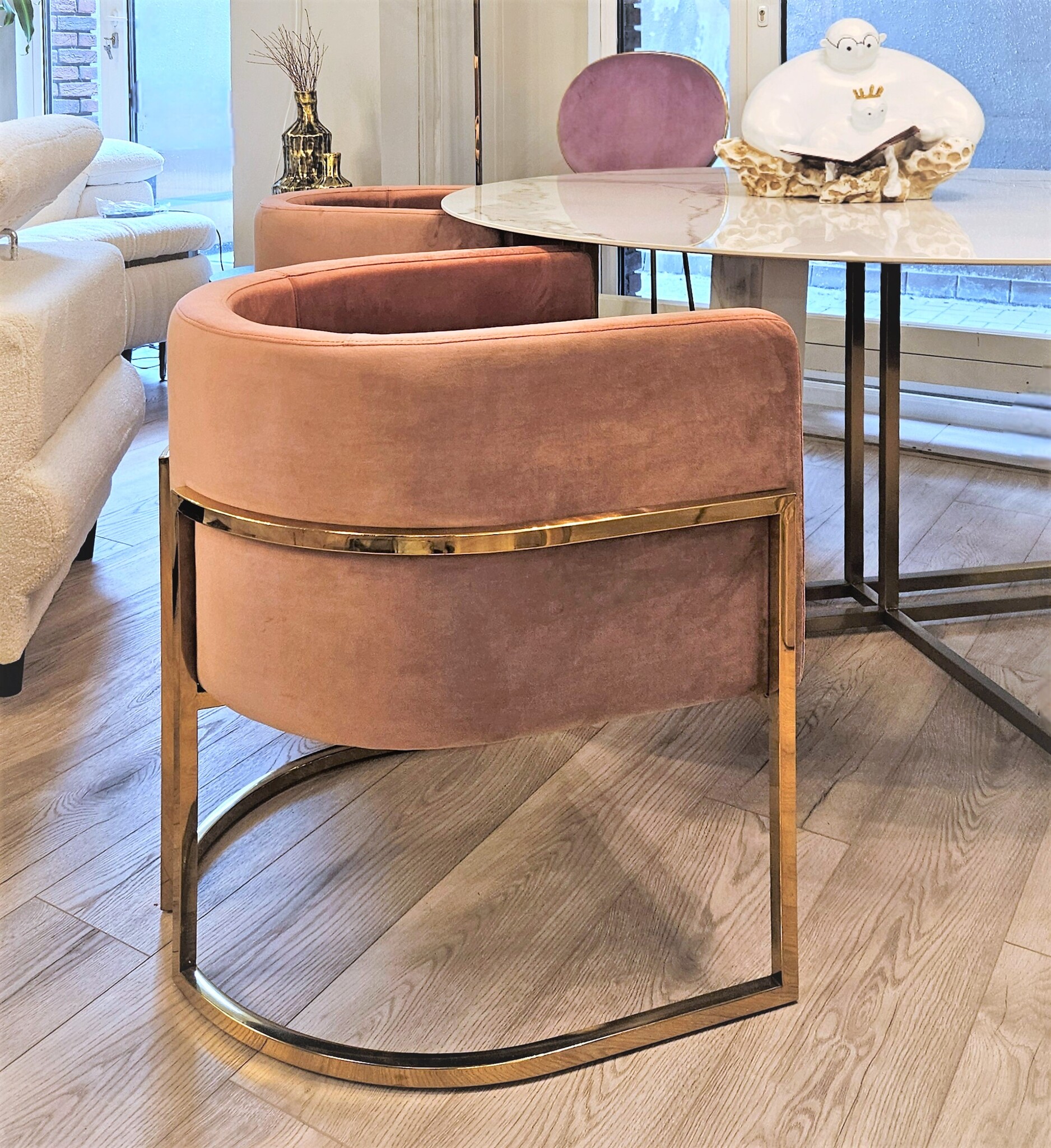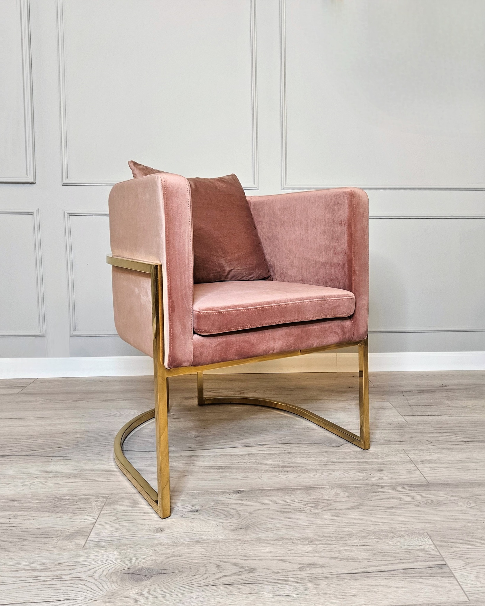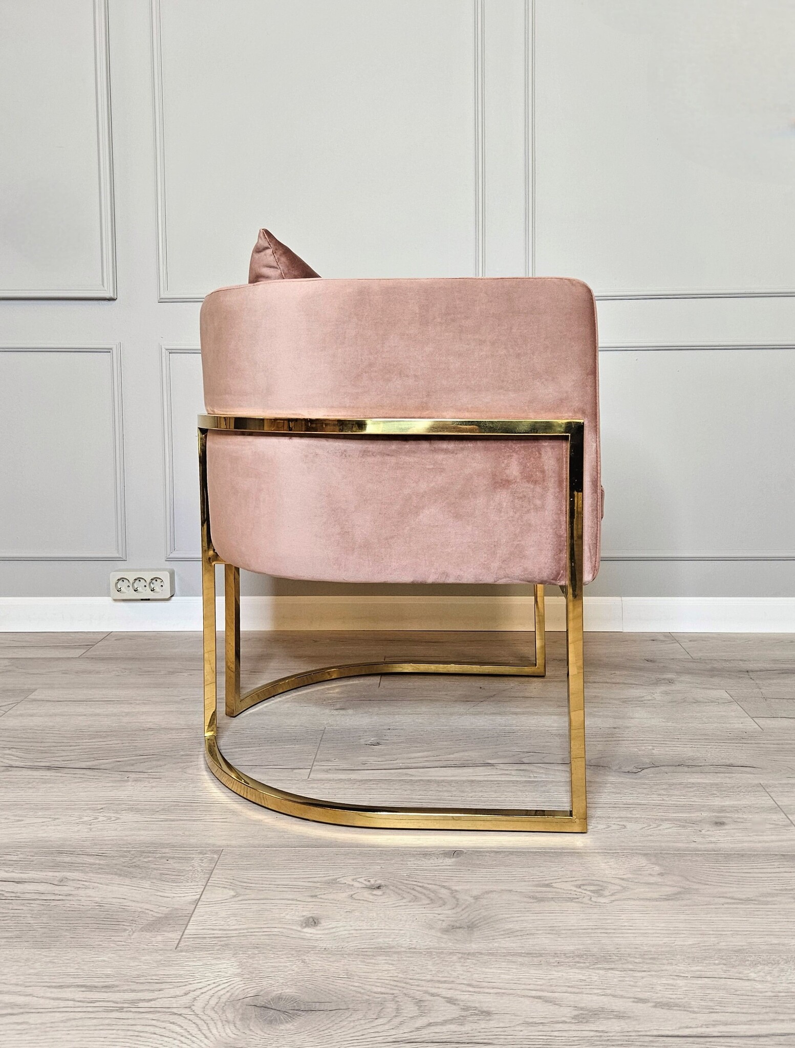 Кресло представлено в ткани велюр дымчато-розового цвета.