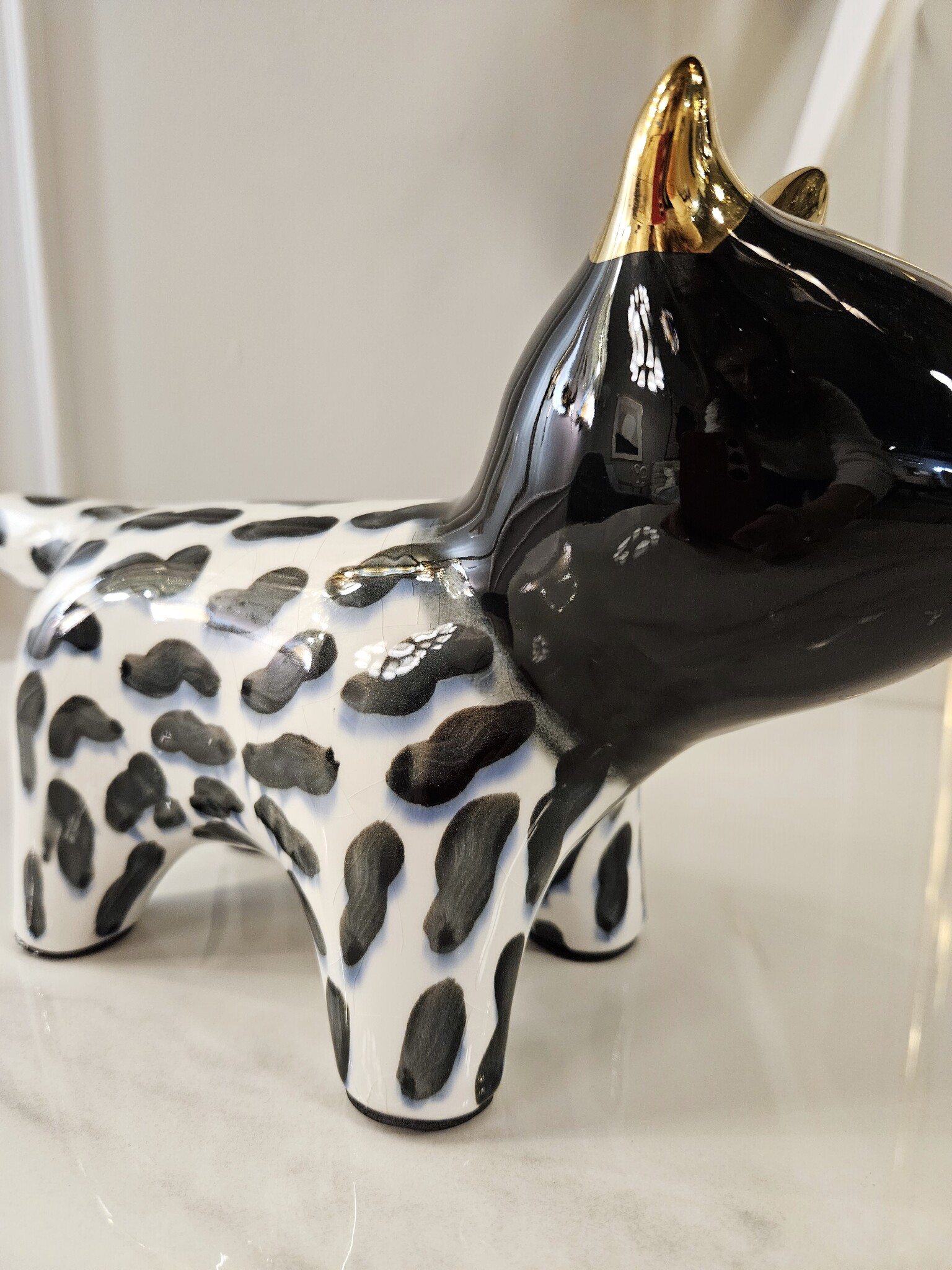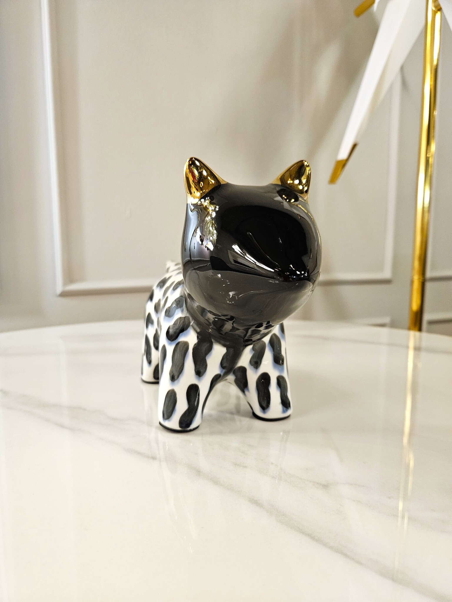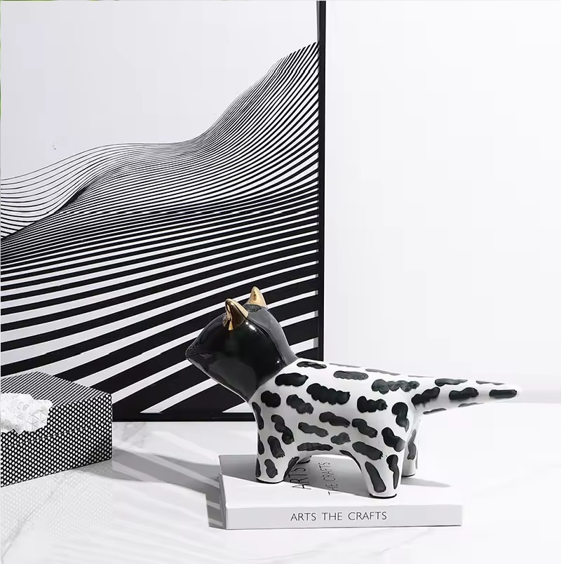 Оригинальная в современный стиле статуэтка собачки с черно-белой текстурой.