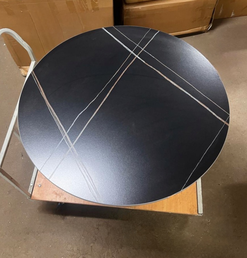 Столешница из прочного износостойкого керамогранита, выполнена в черном цвете с серыми и рыжими линиями. Поверхность столешницы гладкая матовая.