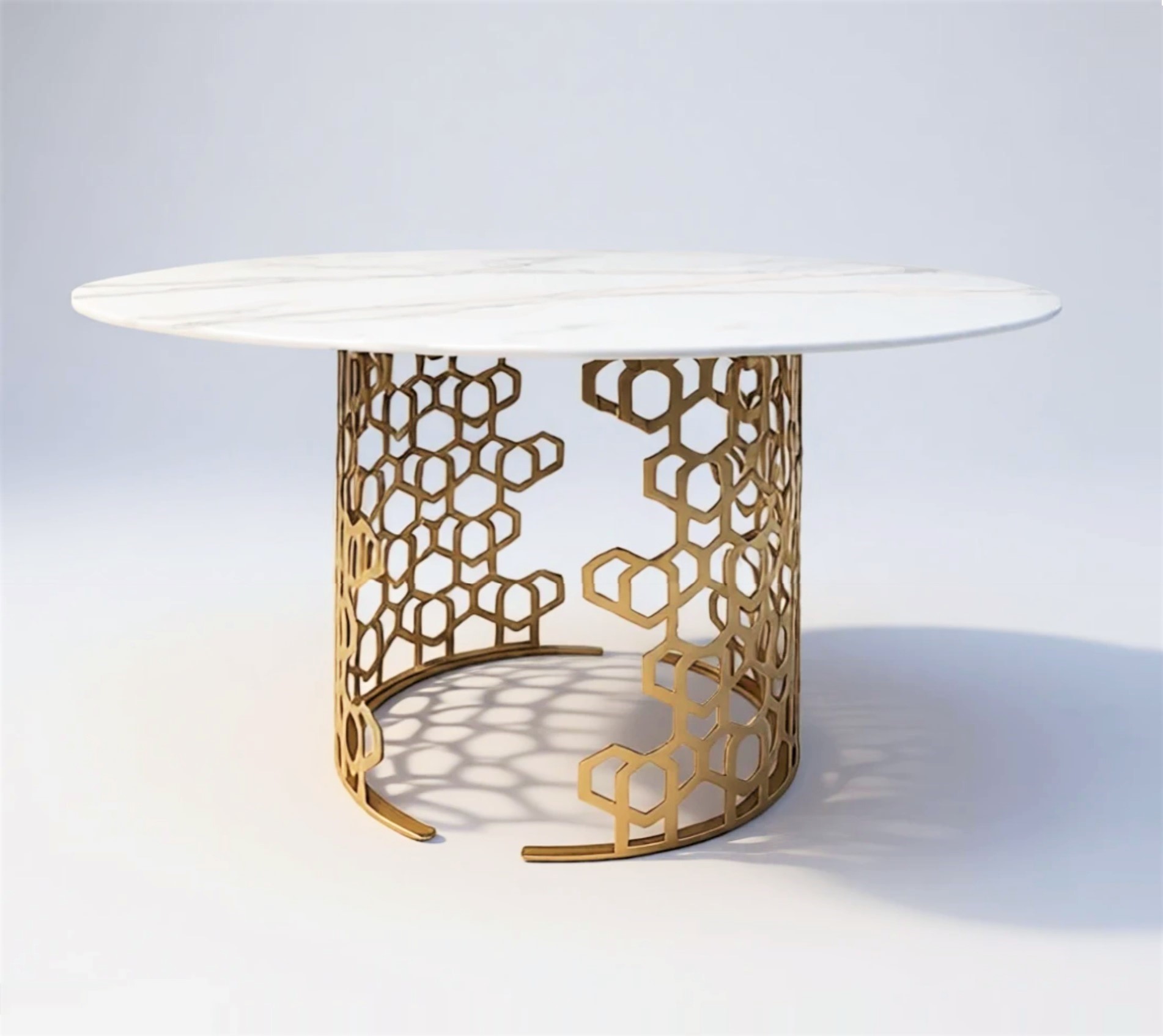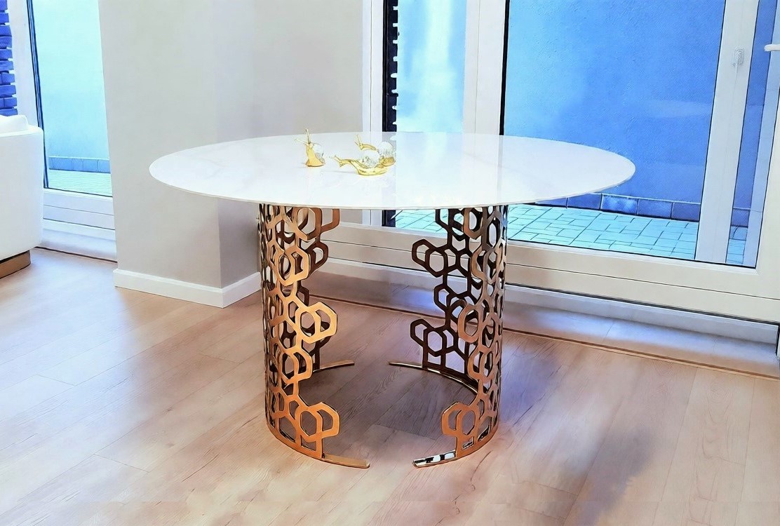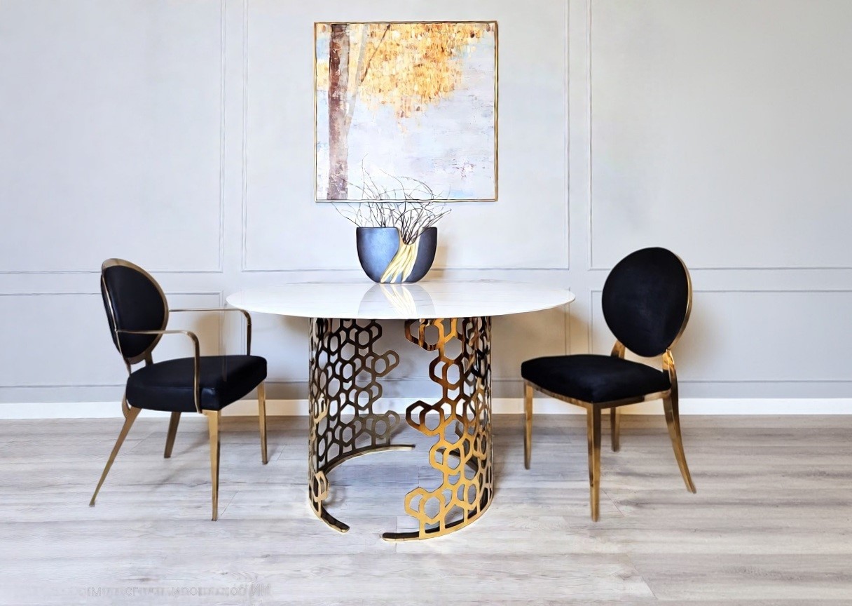 Роскошный цвет золота стального кружева привлекает внимание оригинальностью дизайна. Стол как бы парит над землей, что создает ощущение воздушности и легкости.