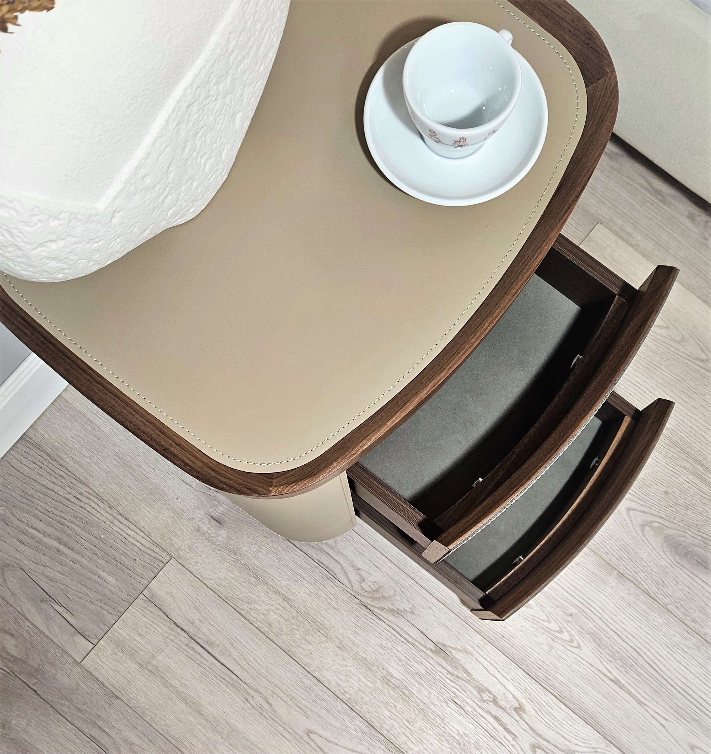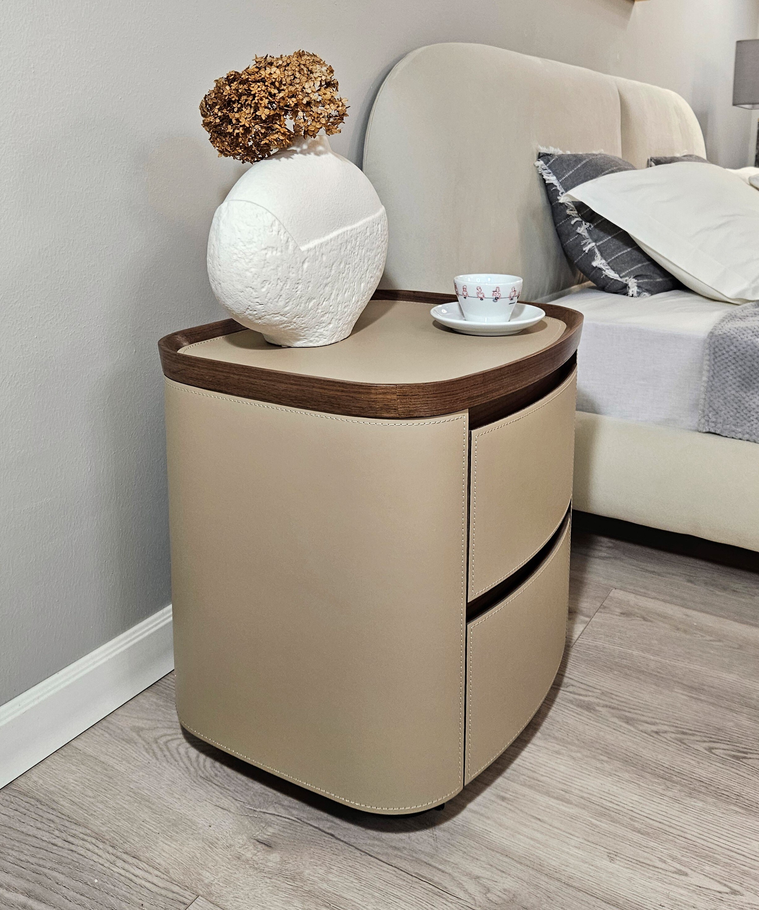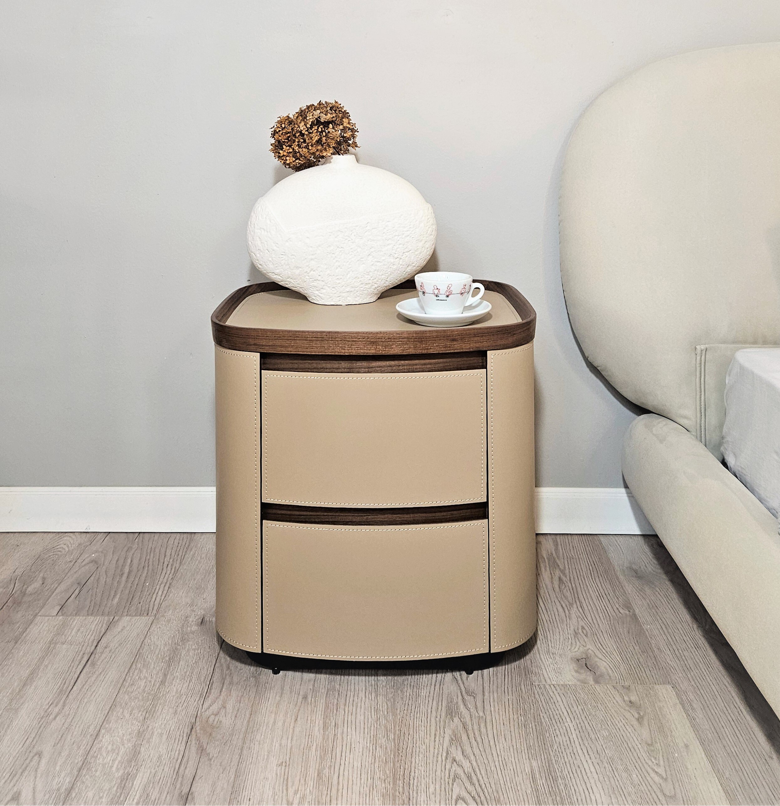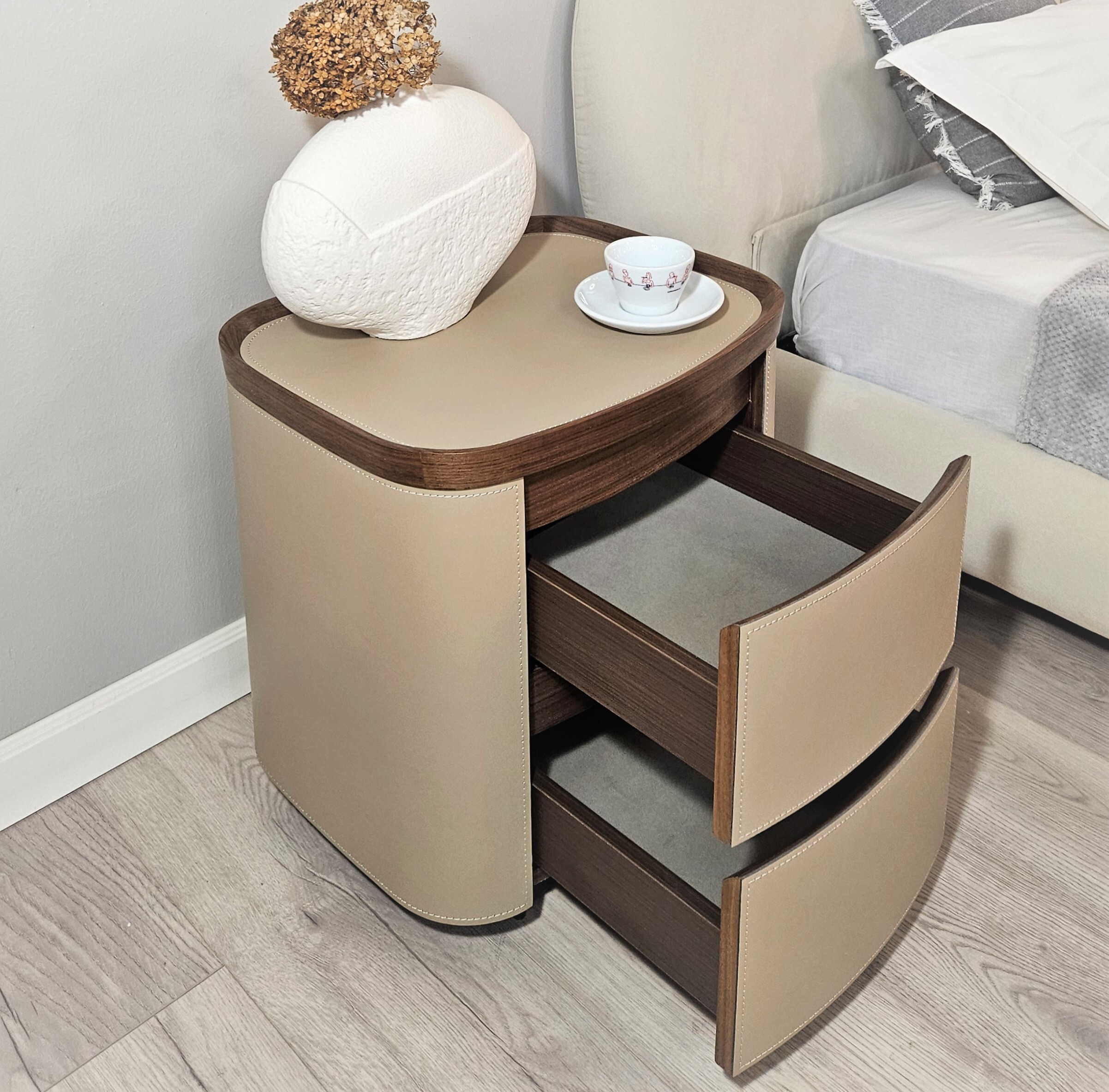 Стильный дизайн, округлая форма и натуральные материалы делают тумбу подходящей для разных стилей интерьера.