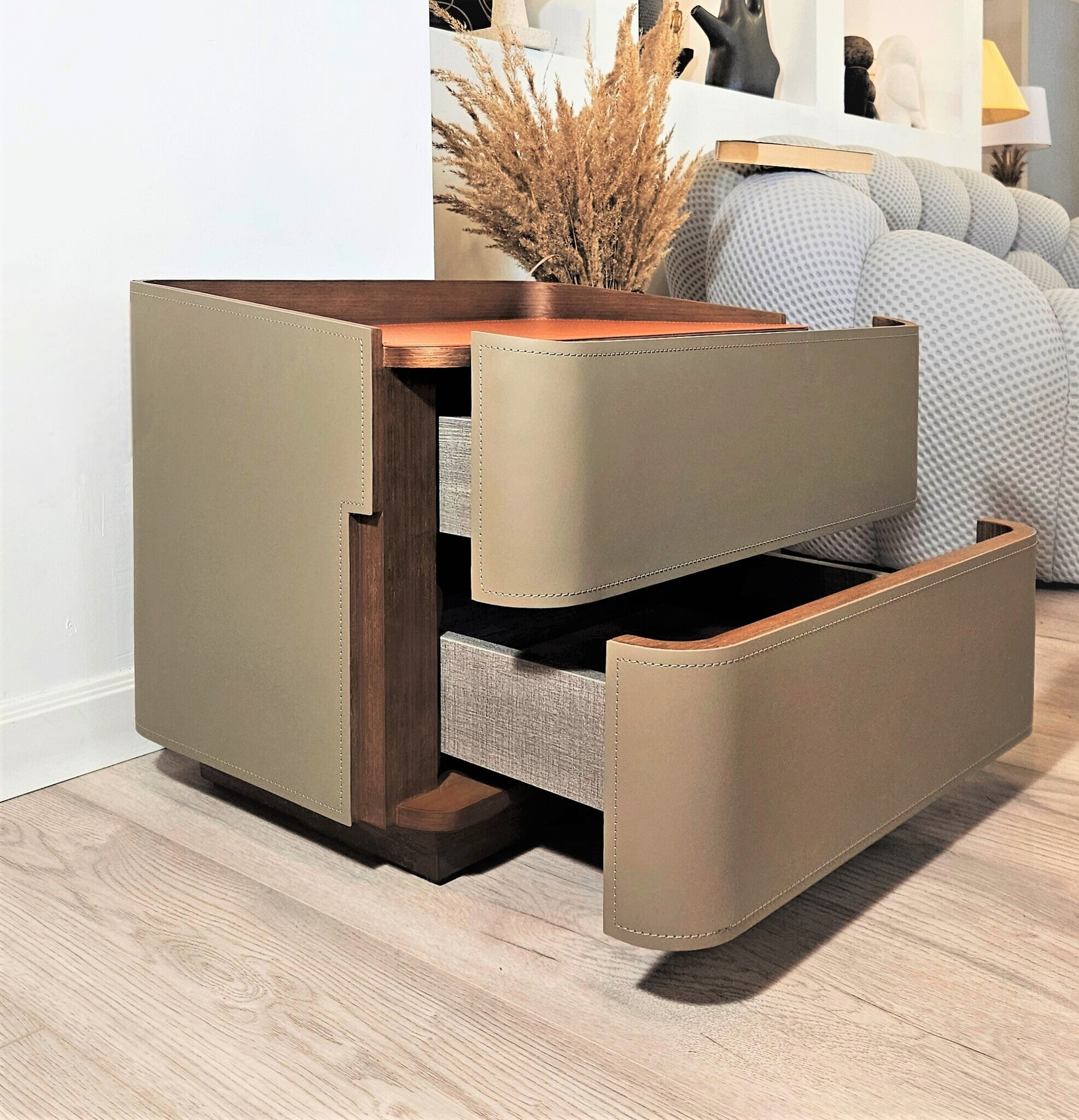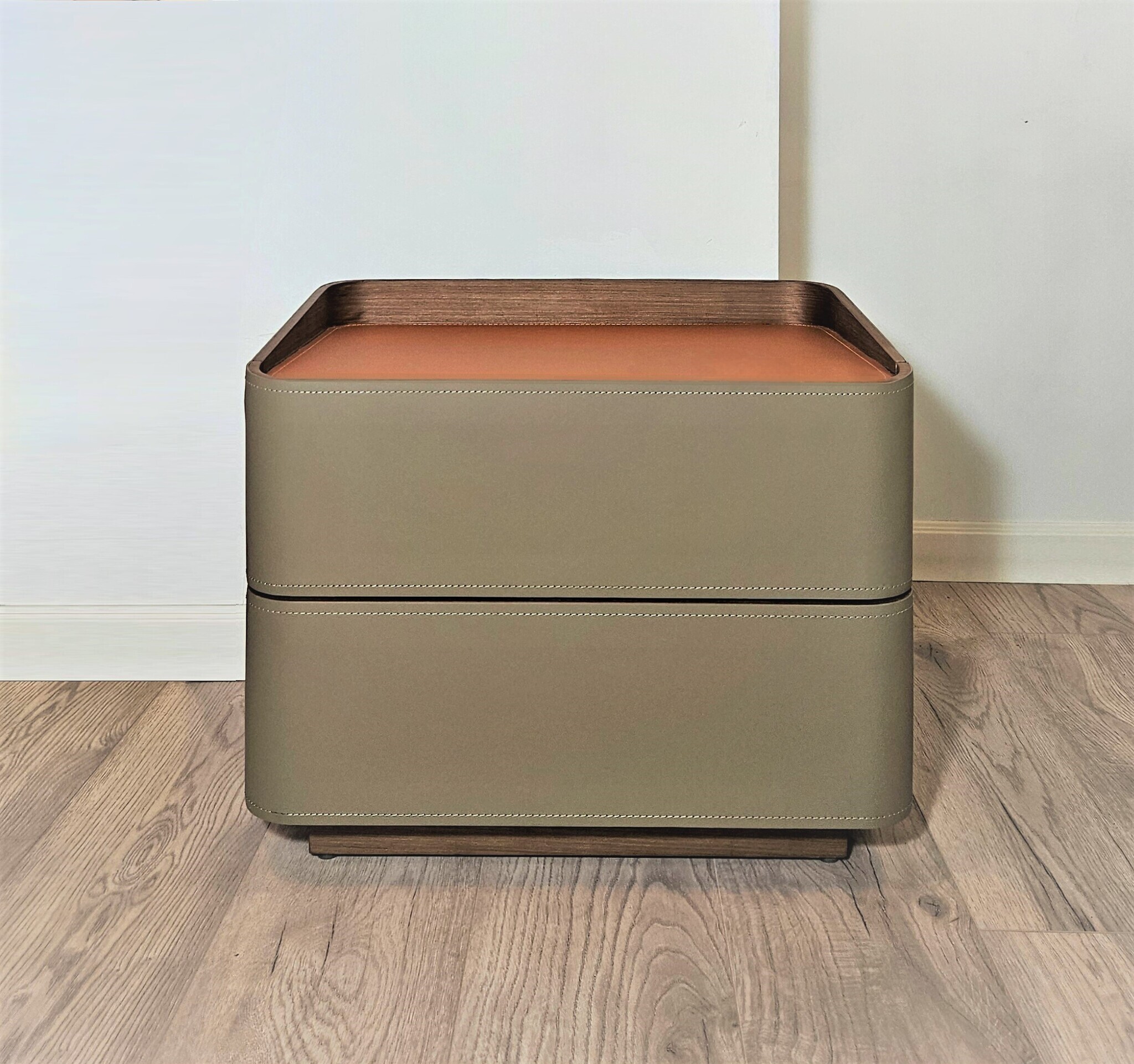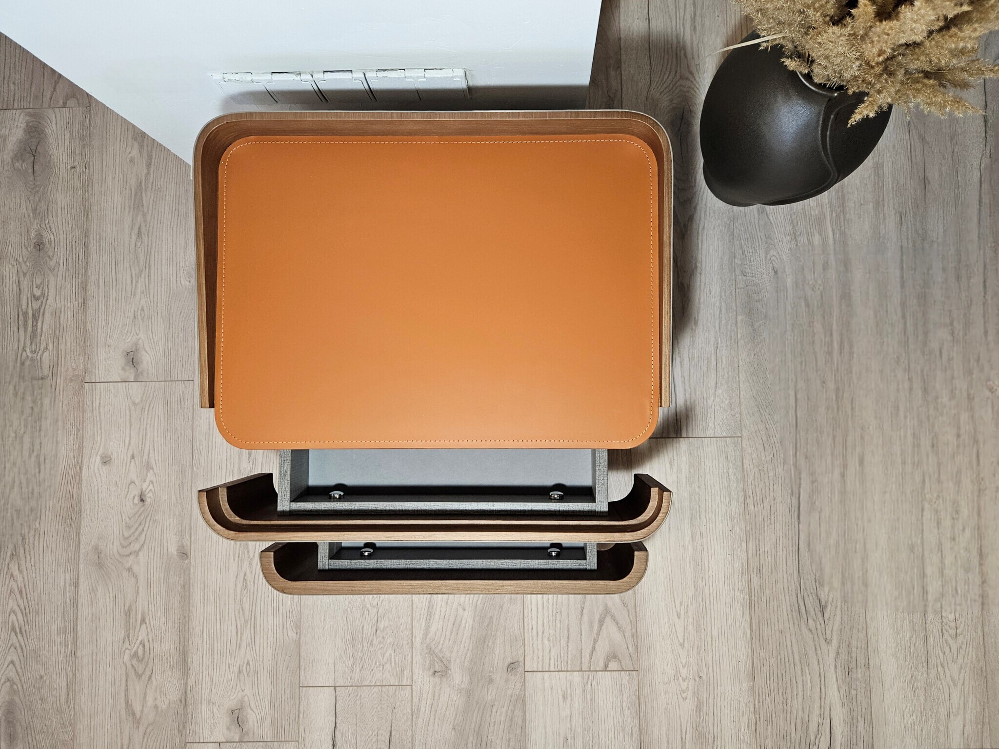 Тумба выполнена из МДФ с отделкой из натурального шпона ореха и экокожи.