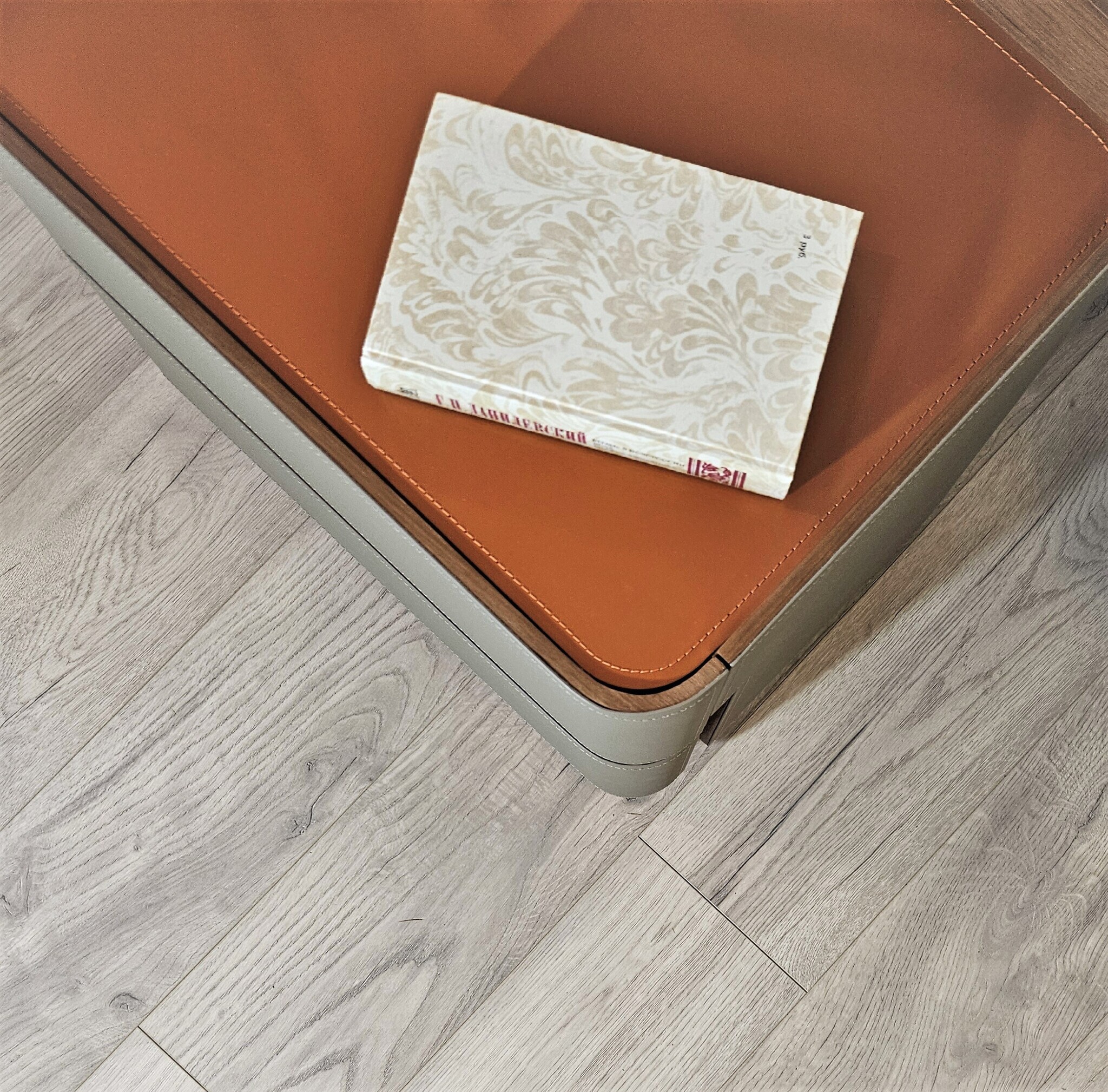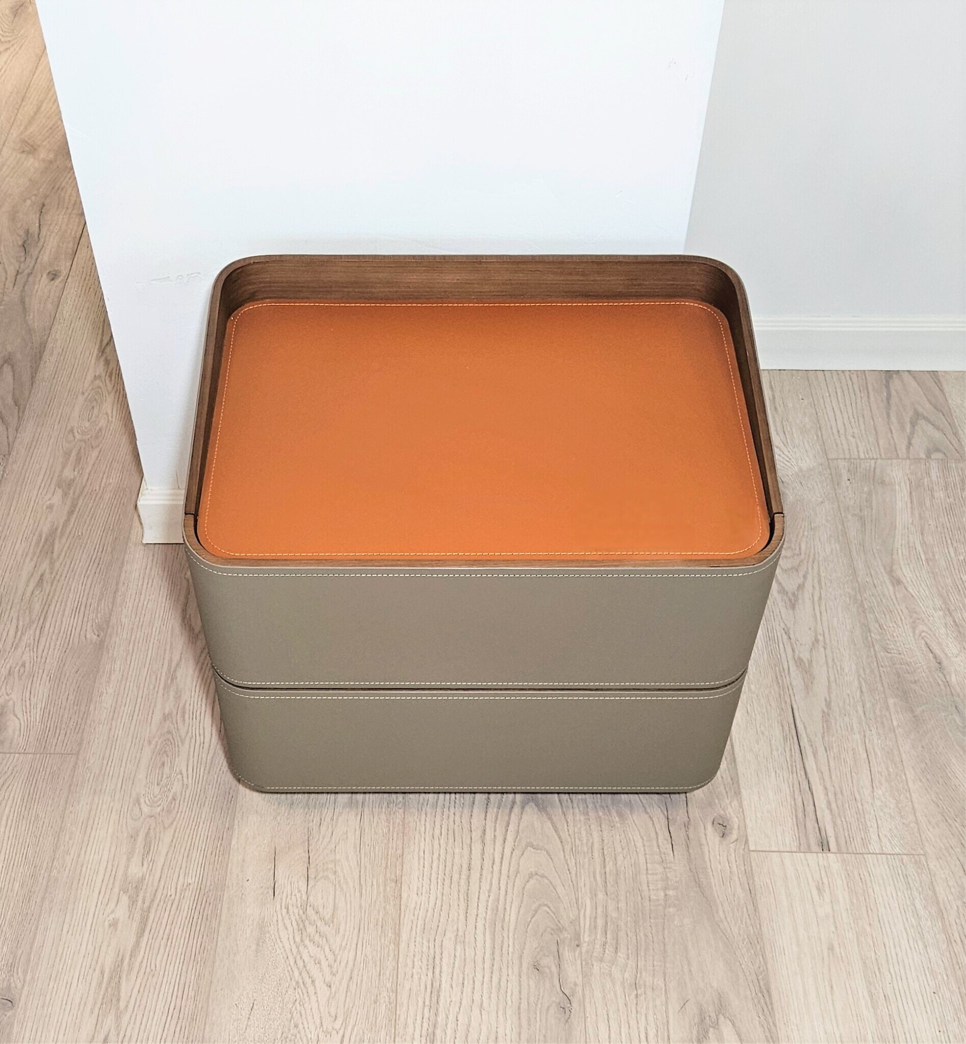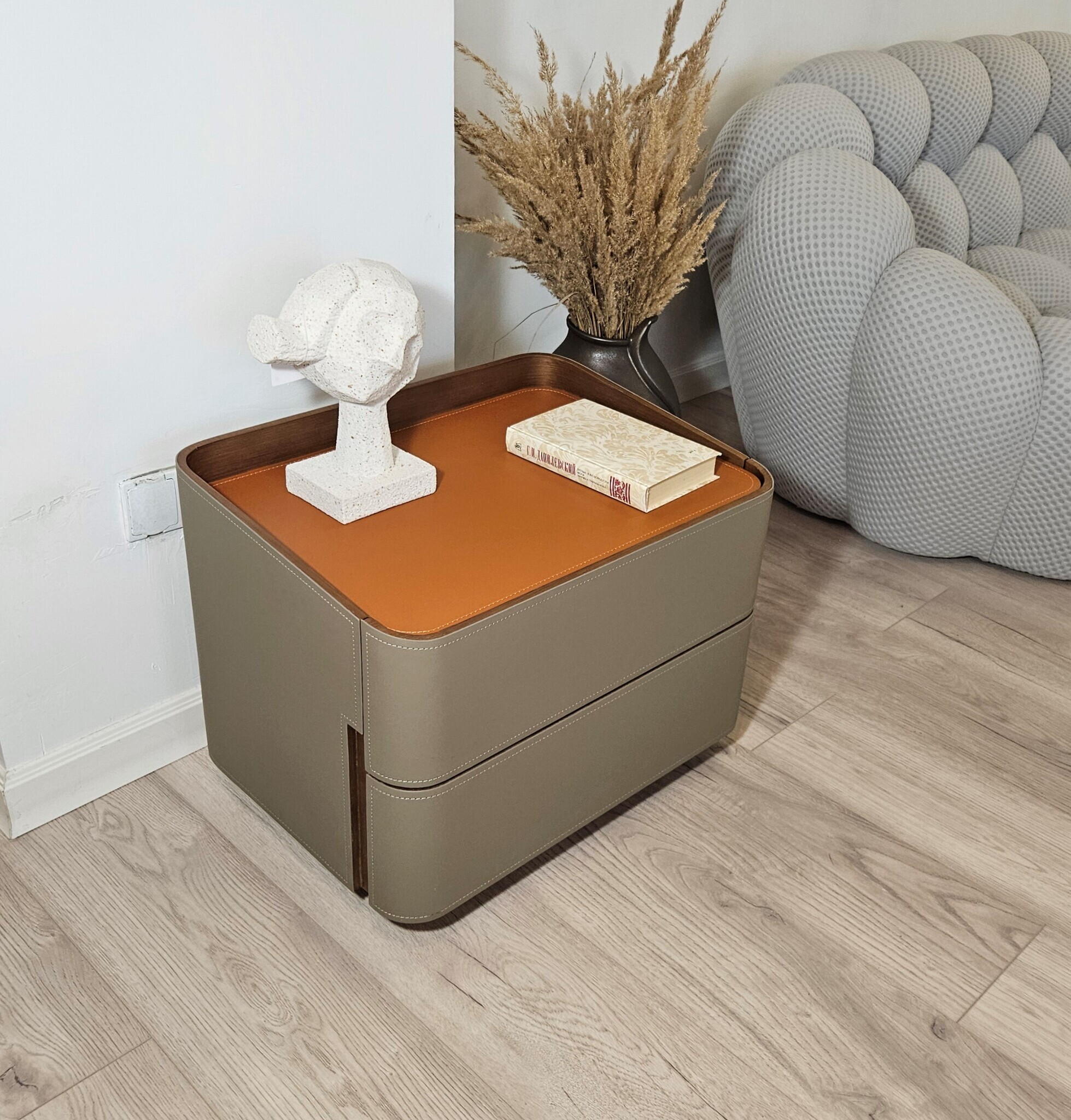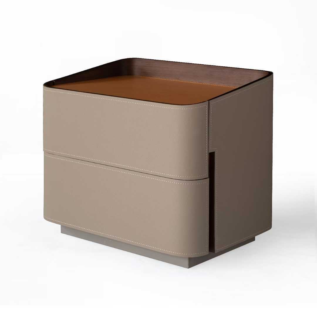 Тумба выполнена из МДФ с отделкой из натурального шпона ореха и экокожи.