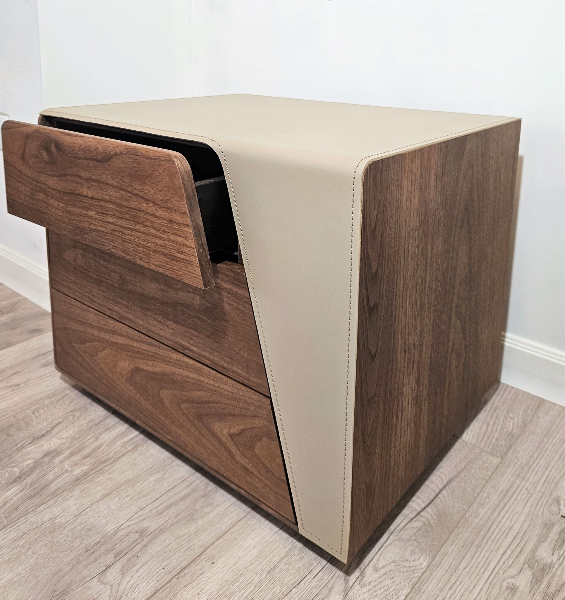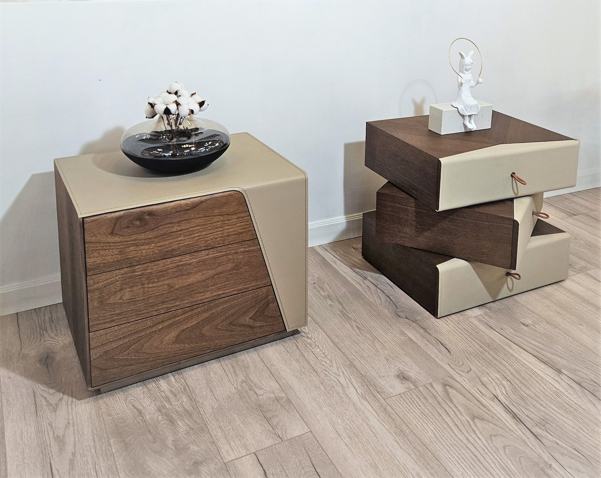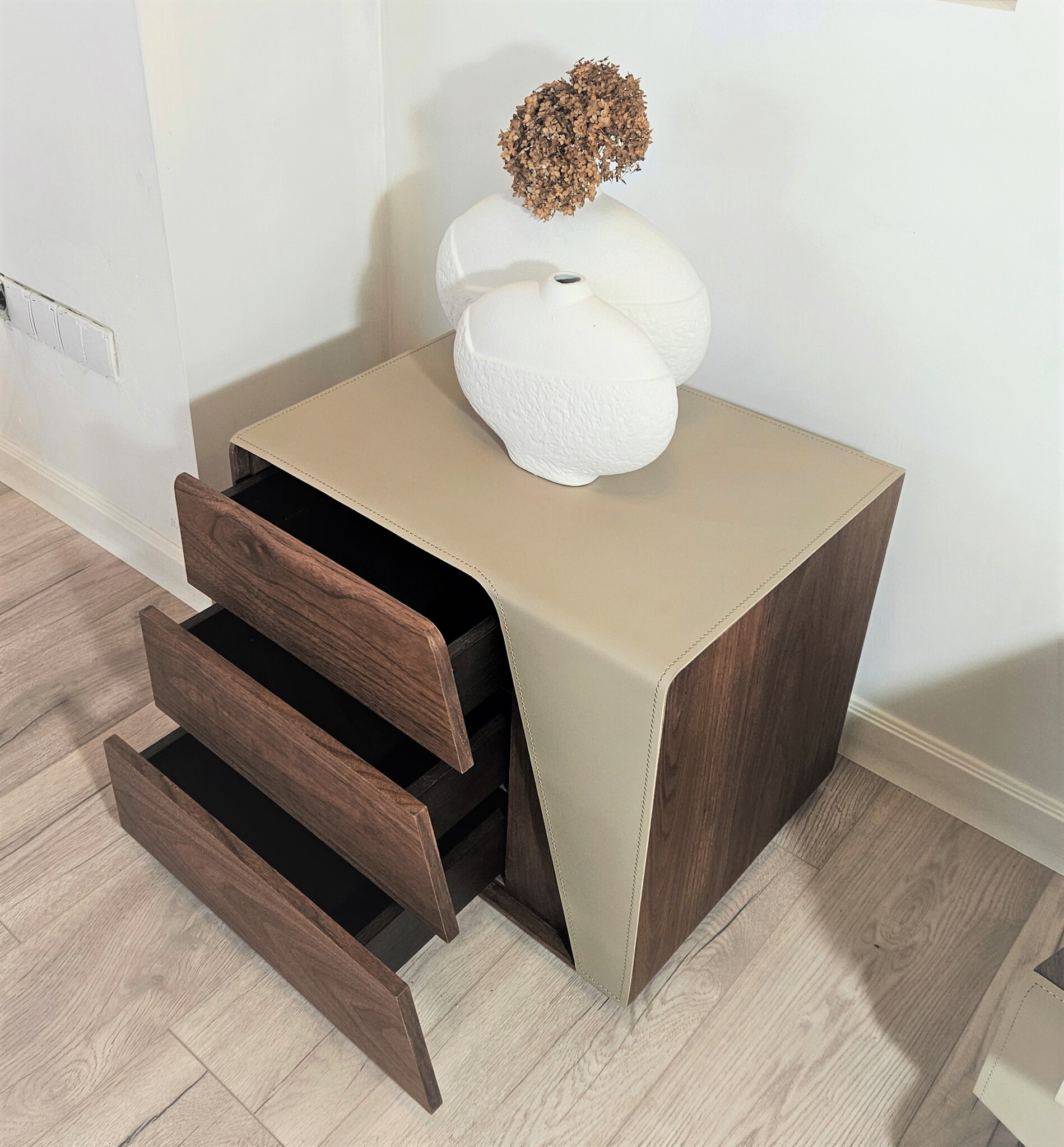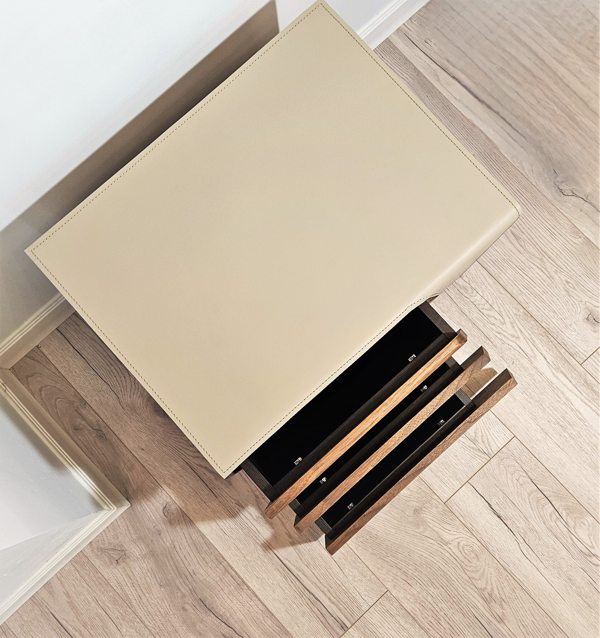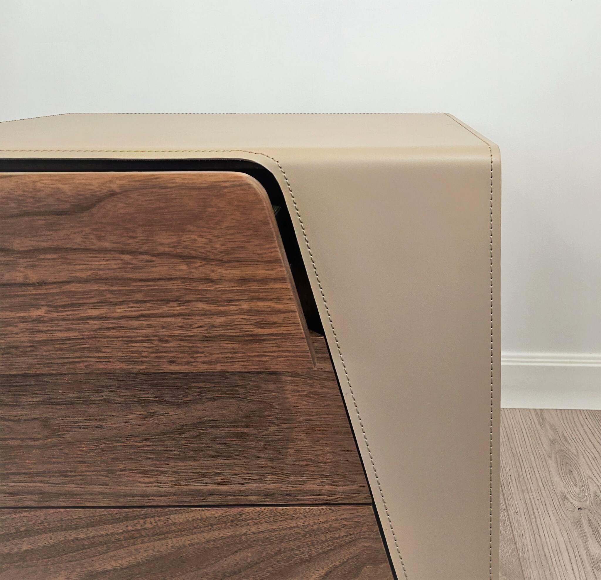 Отделка тумбы выполнена в натуральном шпоне (цвет орех) и в экокоже (цвет серо-бежевый).