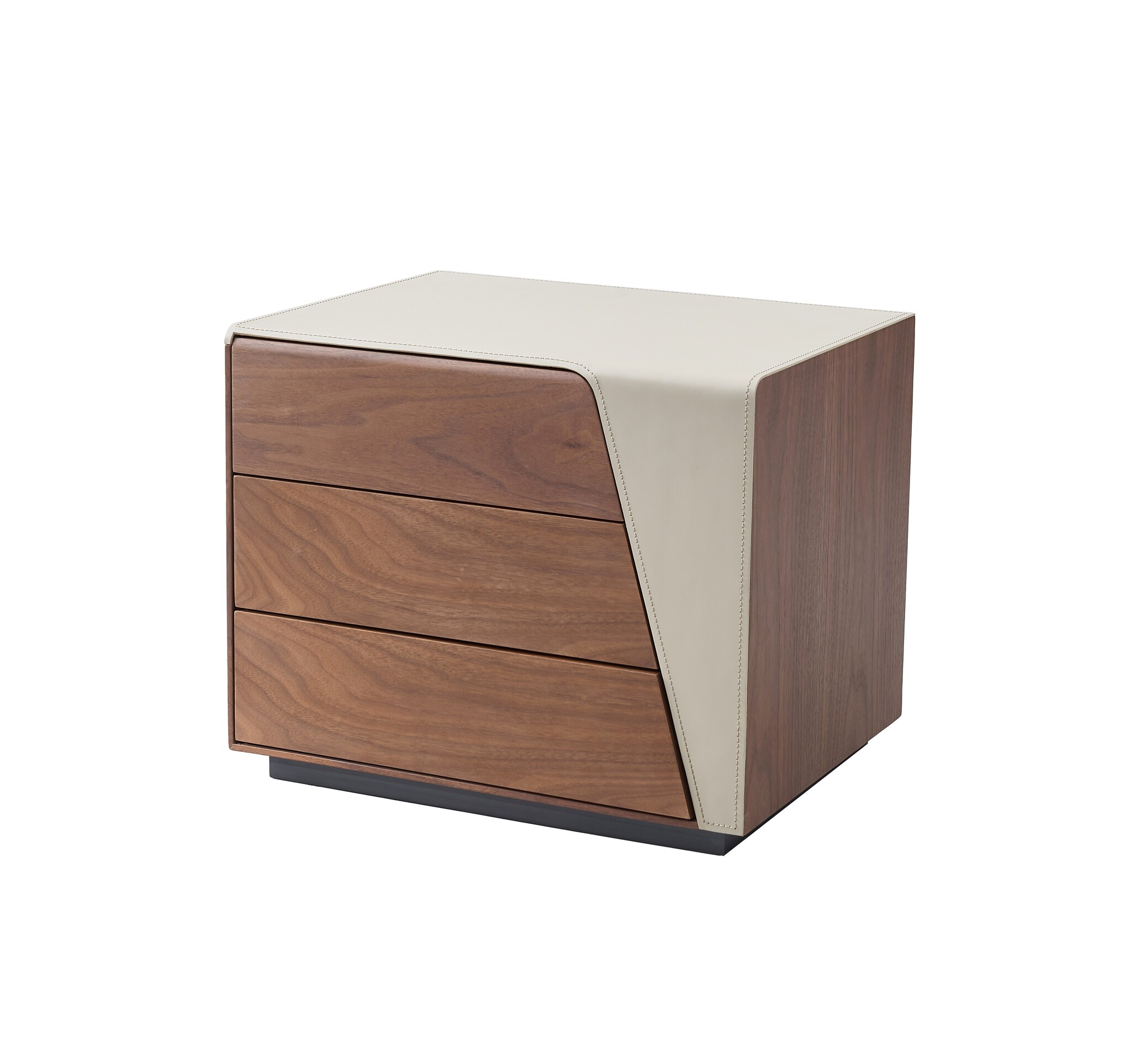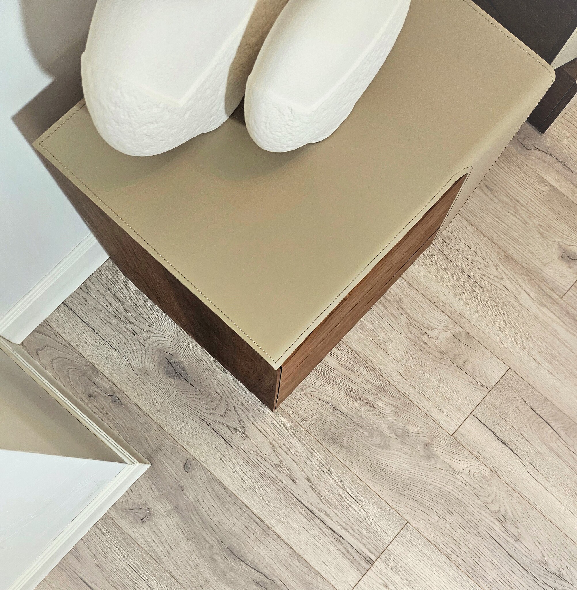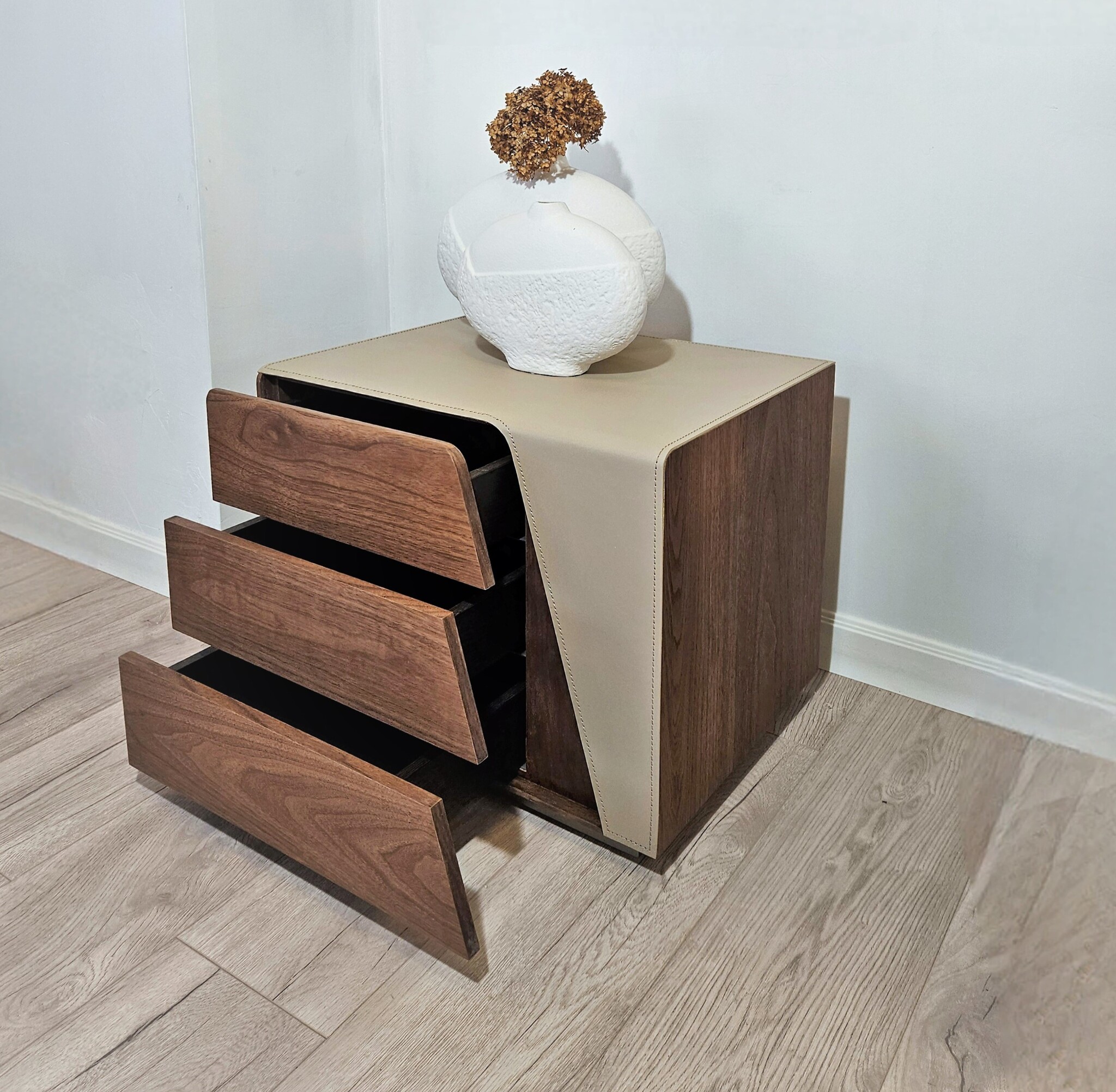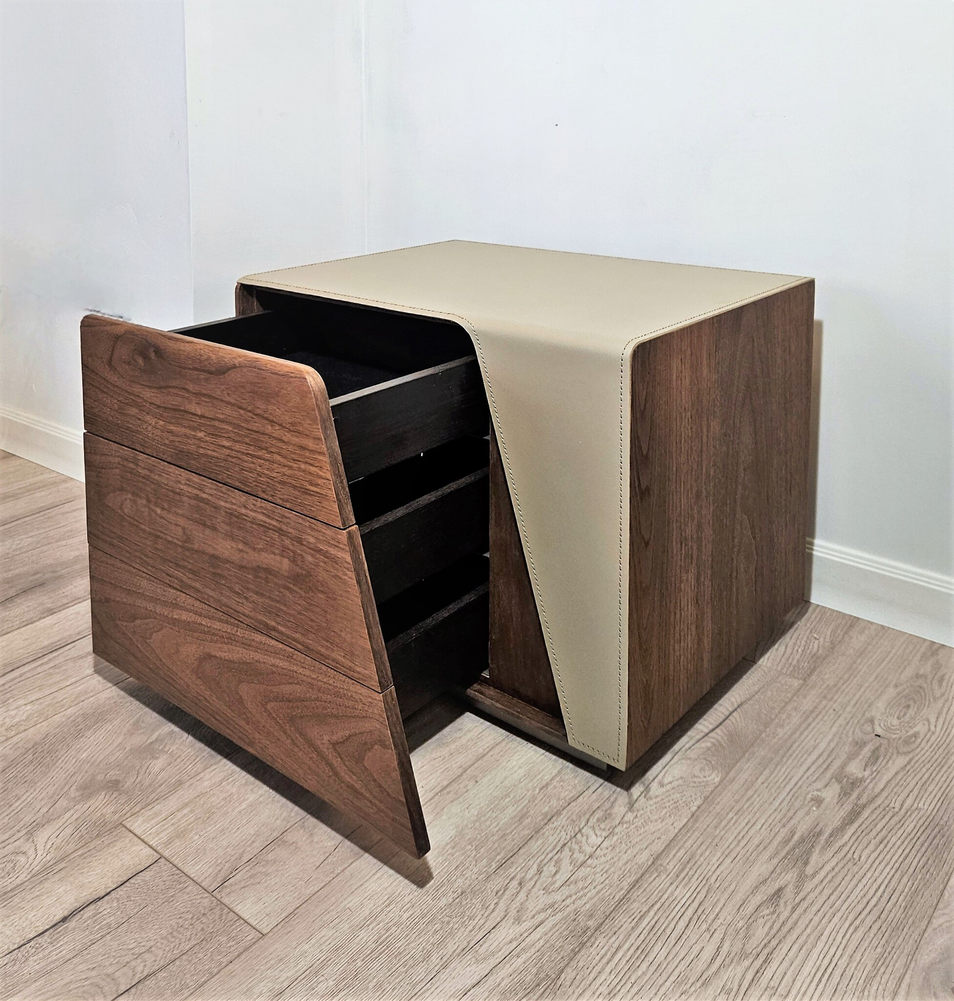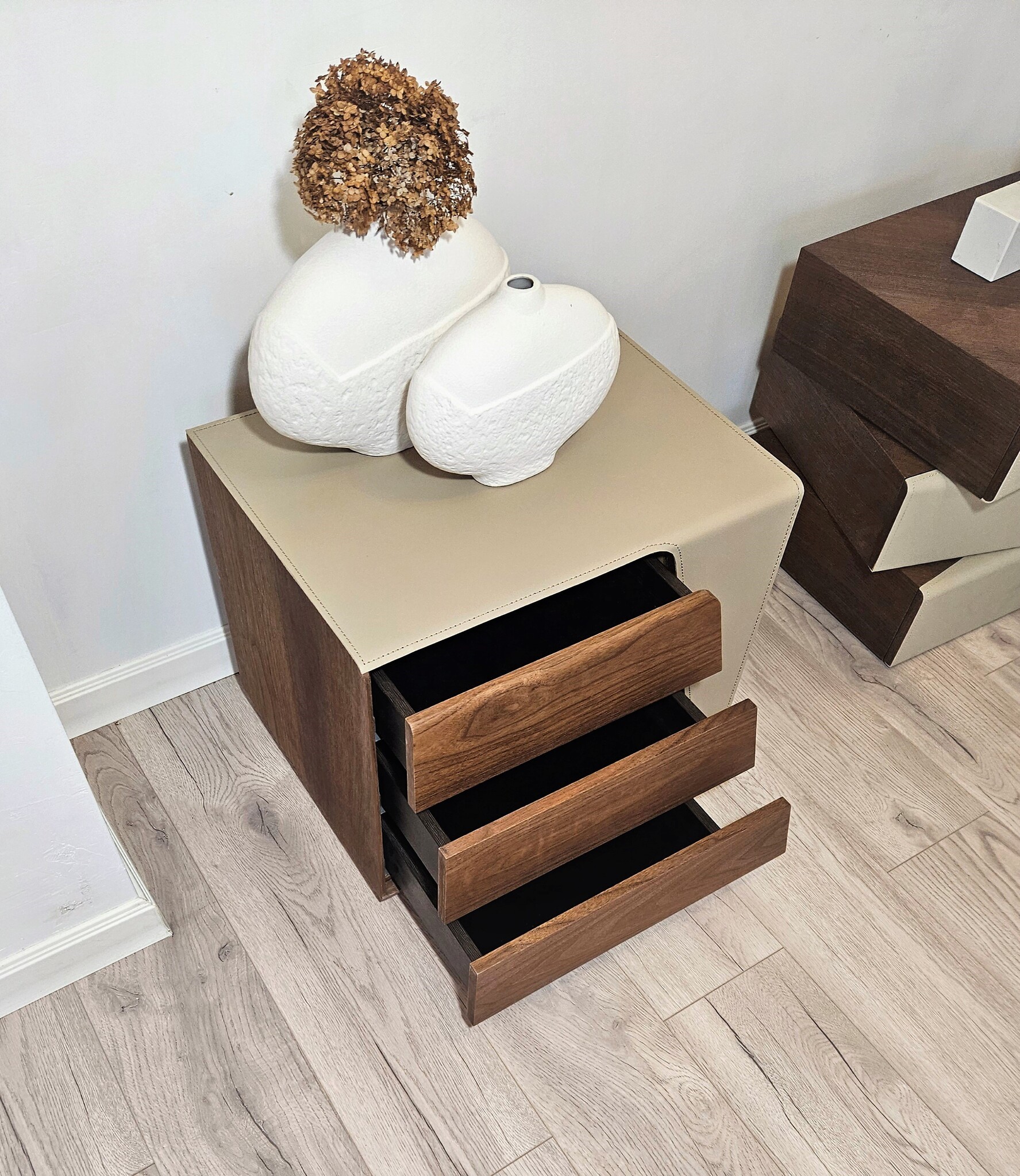 Отделка тумбы выполнена в натуральном шпоне (цвет орех) и в экокоже (цвет серо-бежевый).
