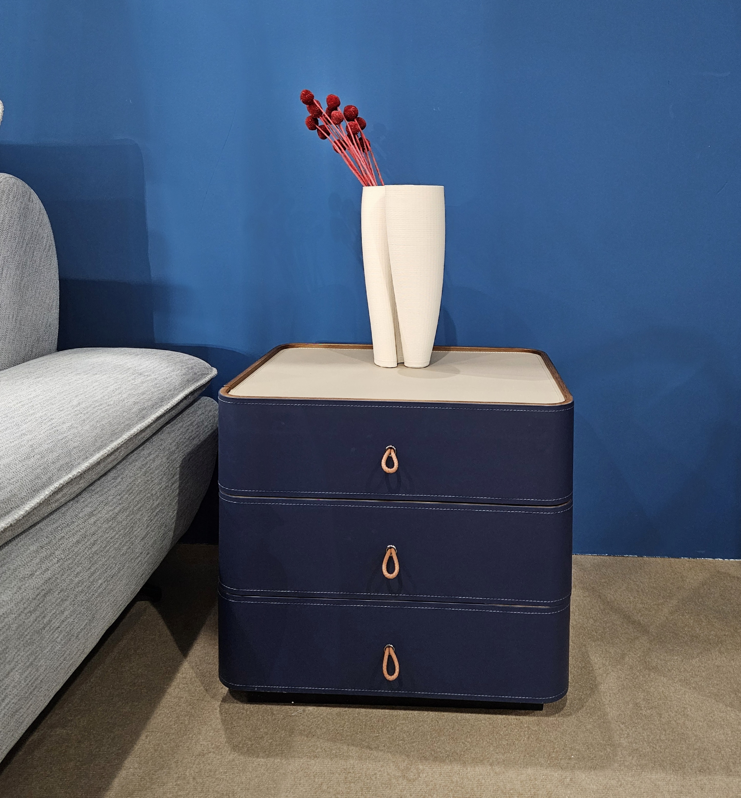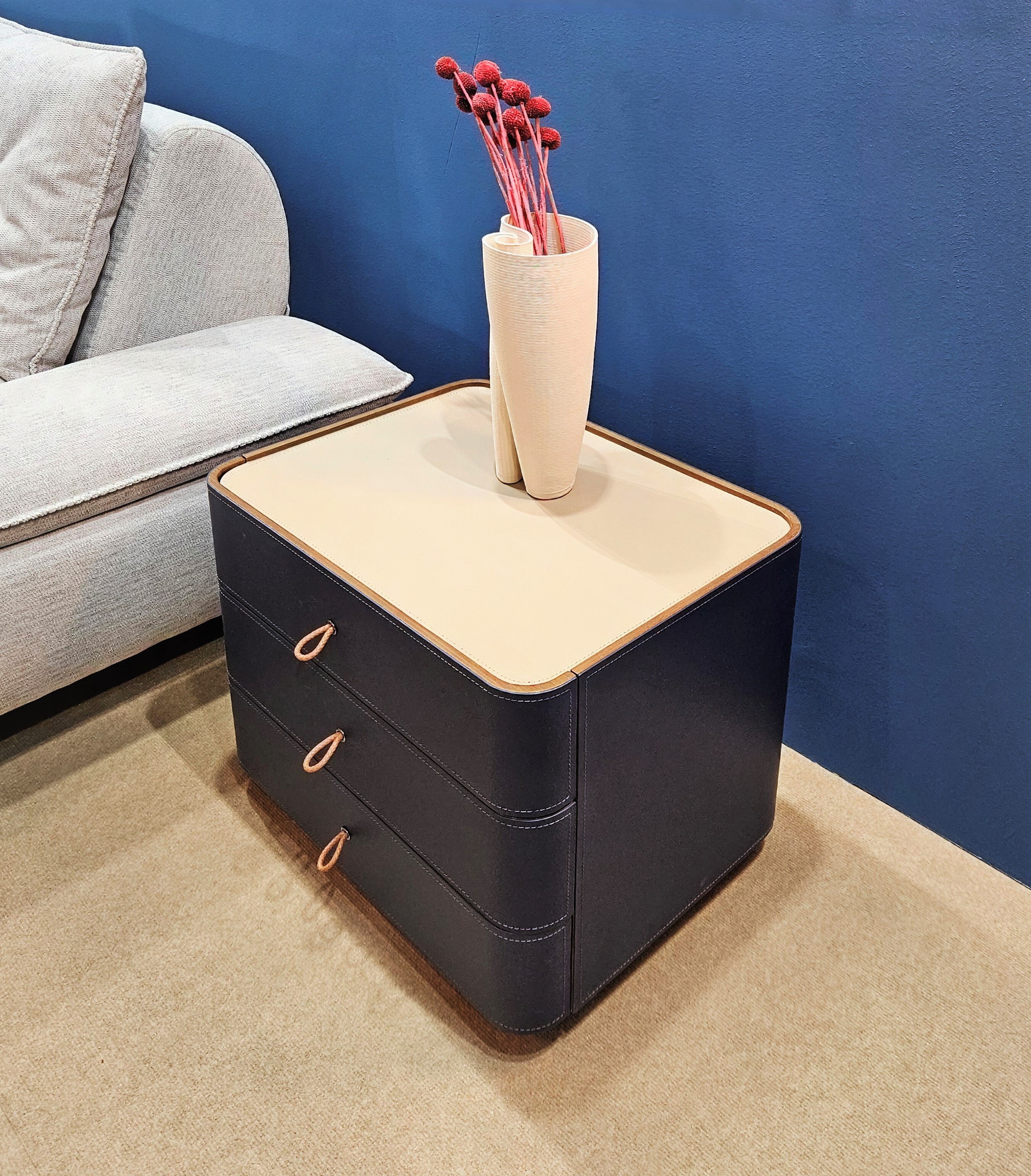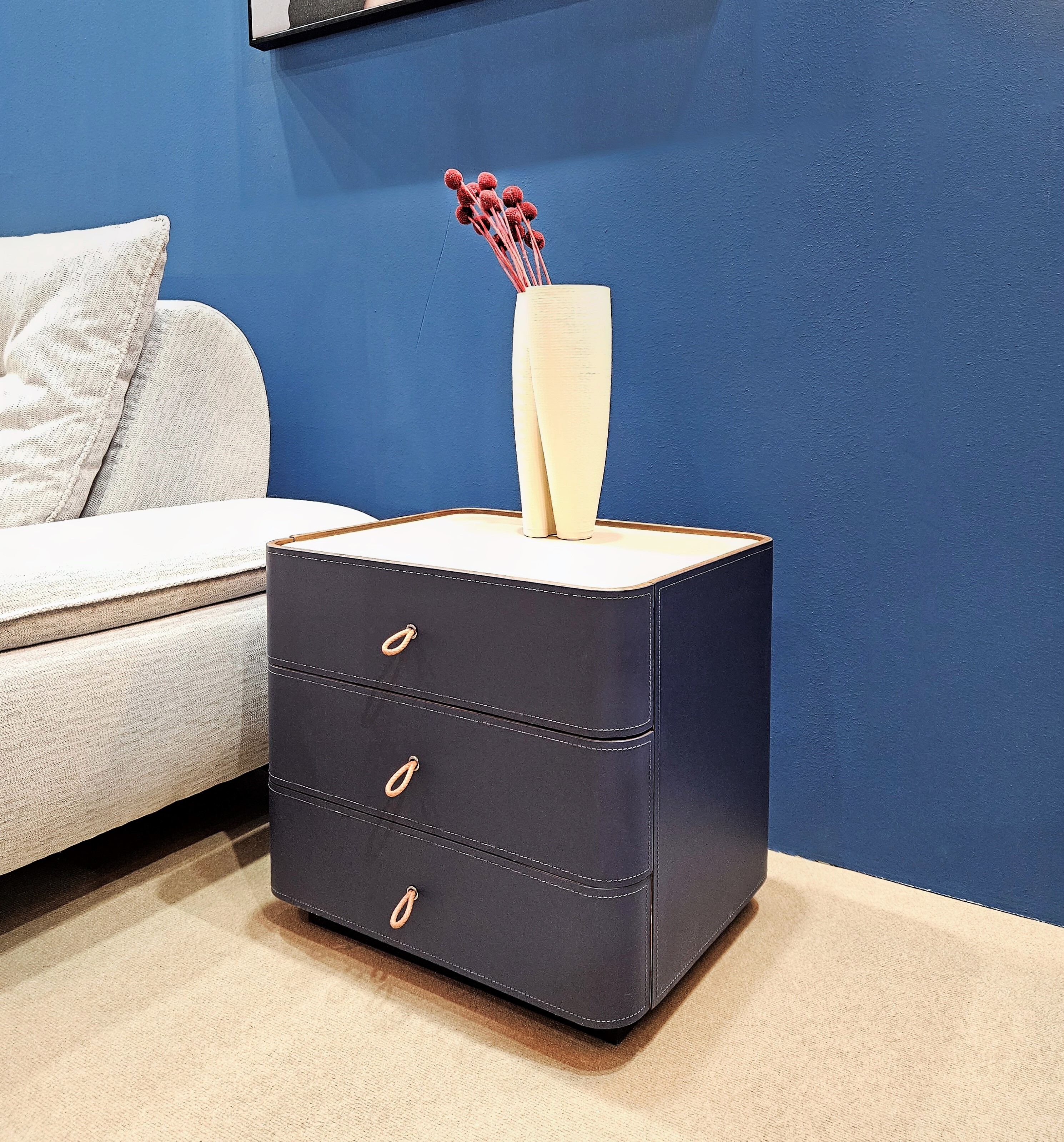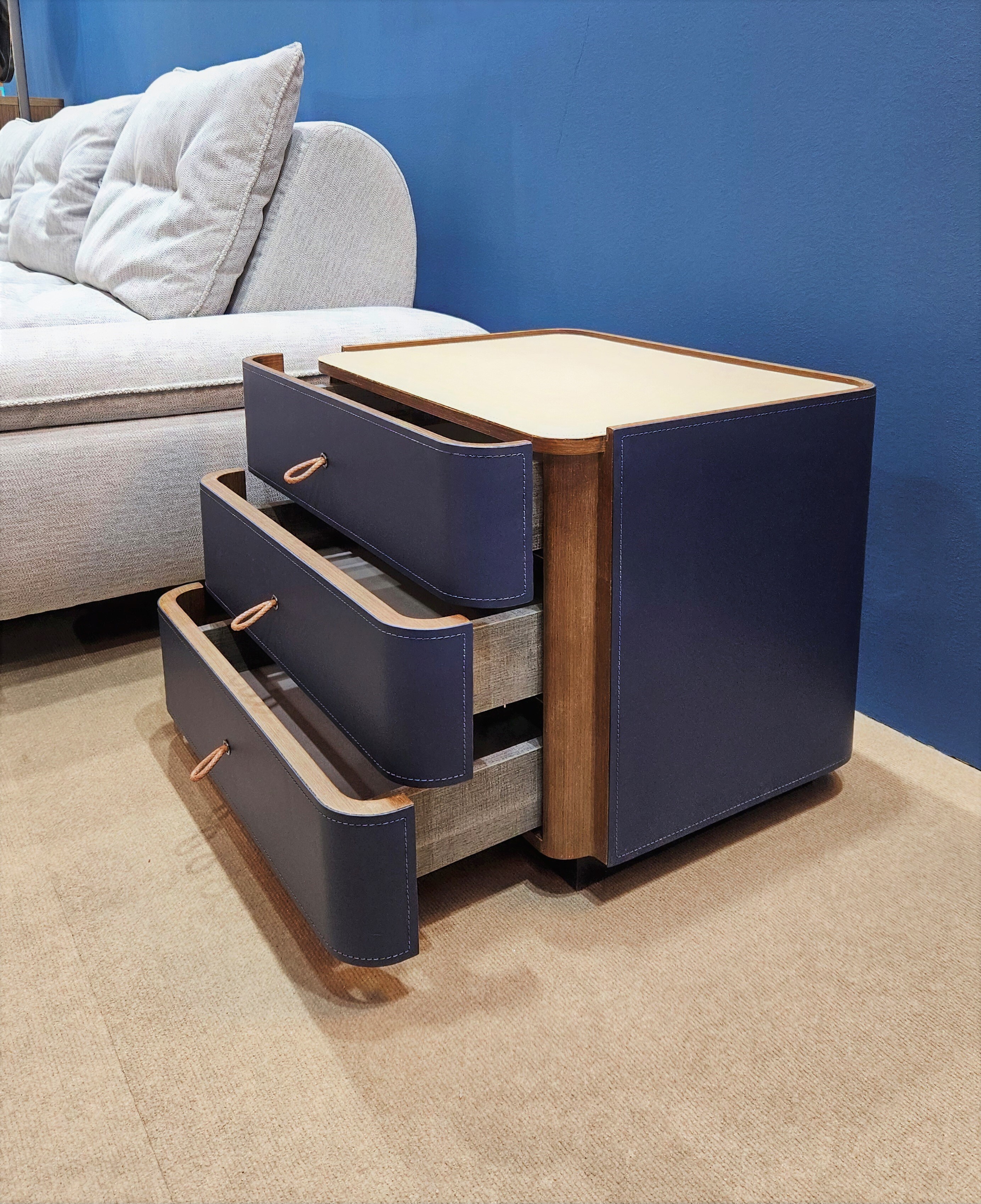 Тумба представлена в экокоже синего цвета.